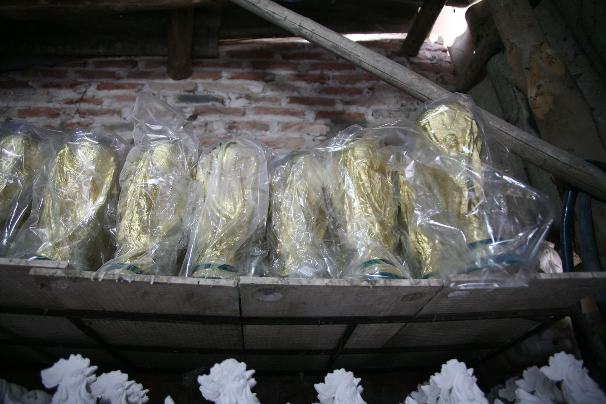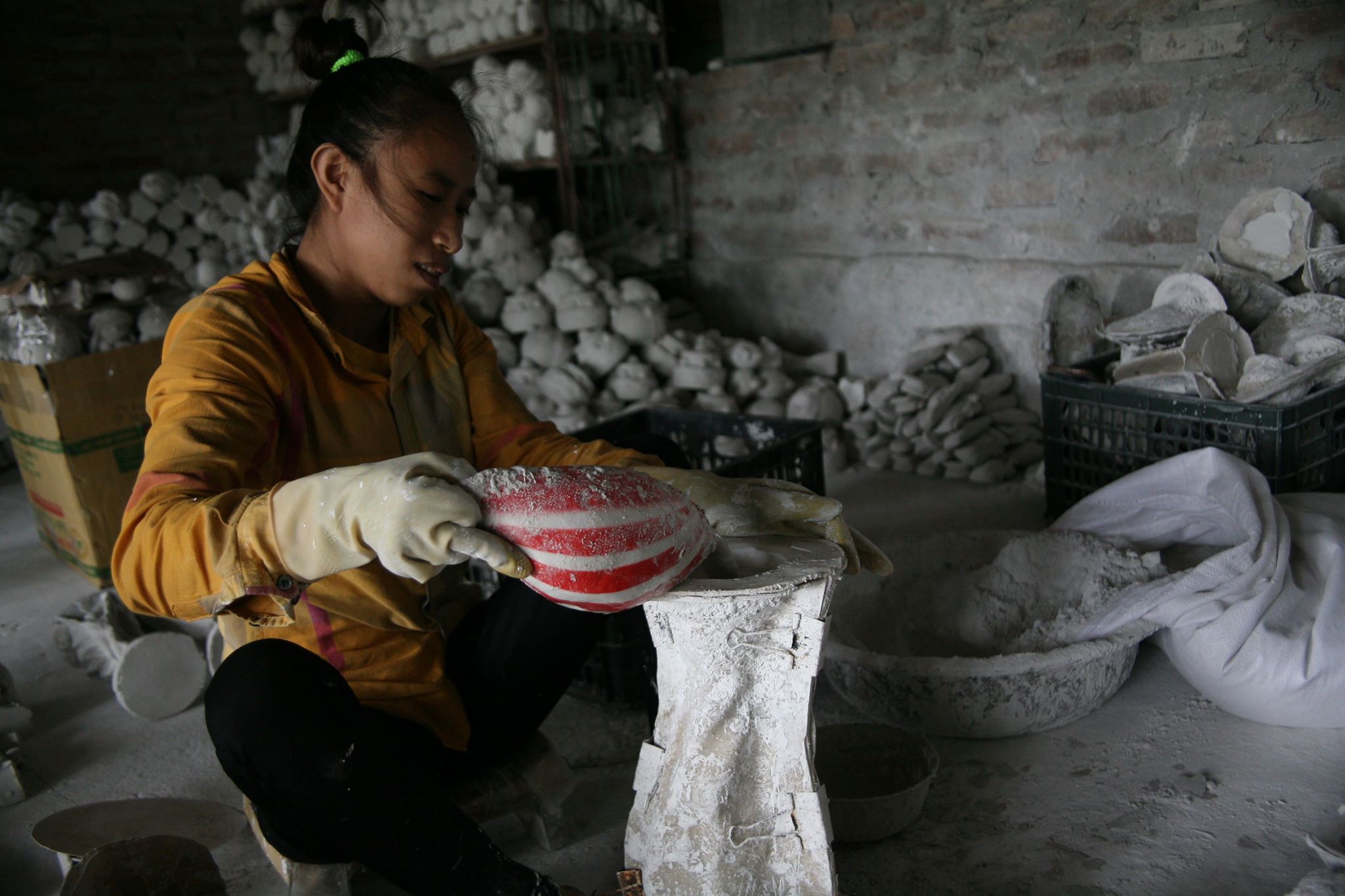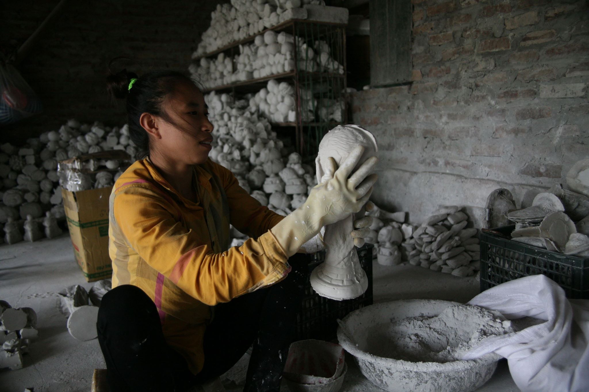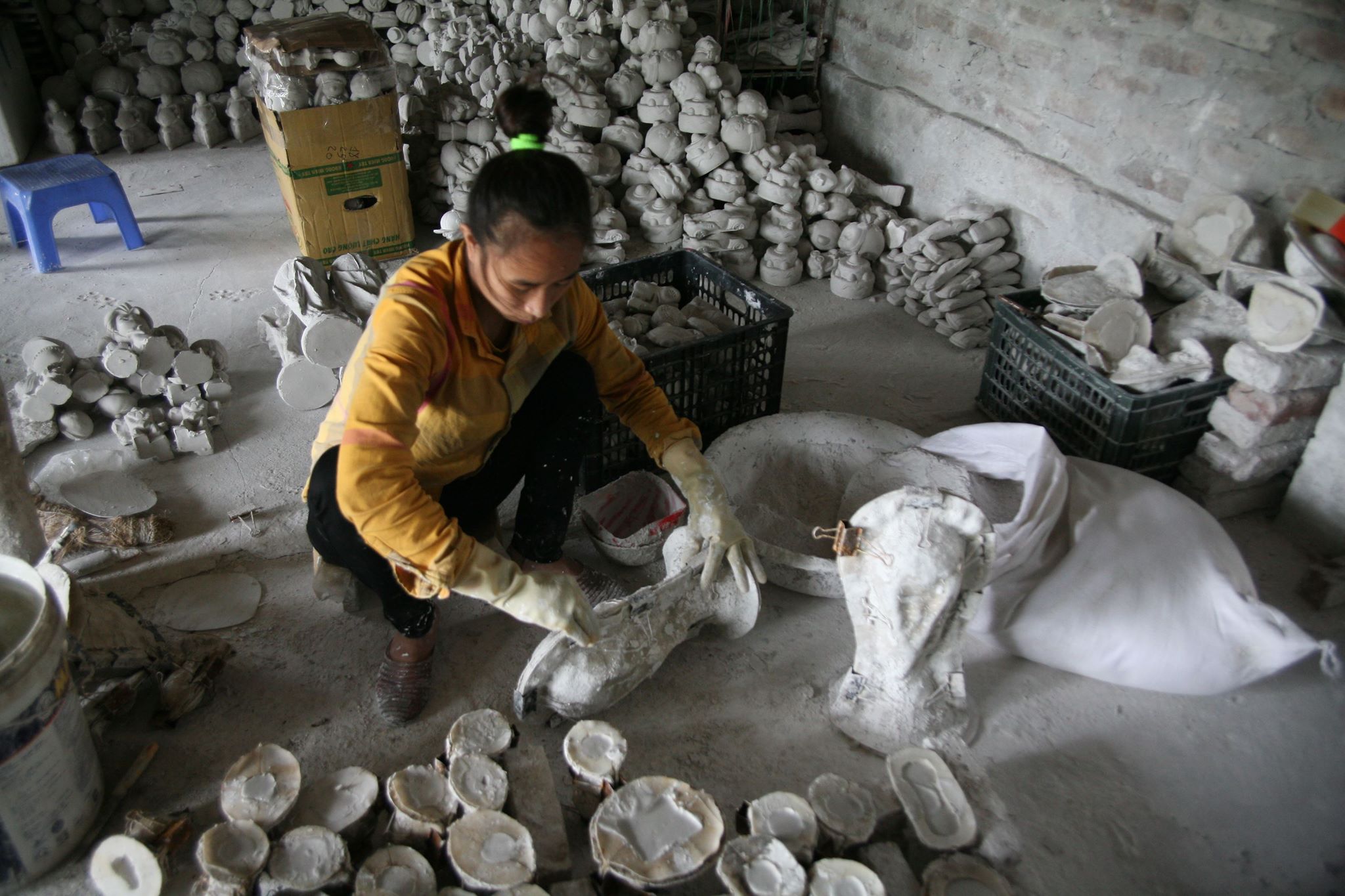 Sau khi đổ khuôn chừng 20 phút thì tháo khuôn, đem ra phơi chừng 3 nắng, nếu không phơi khô thì sản phẩm rất dễ hỏng. Công đoạn tiếp theo là gọt dũa lại sản phẩm, kế đó là phun sơn.