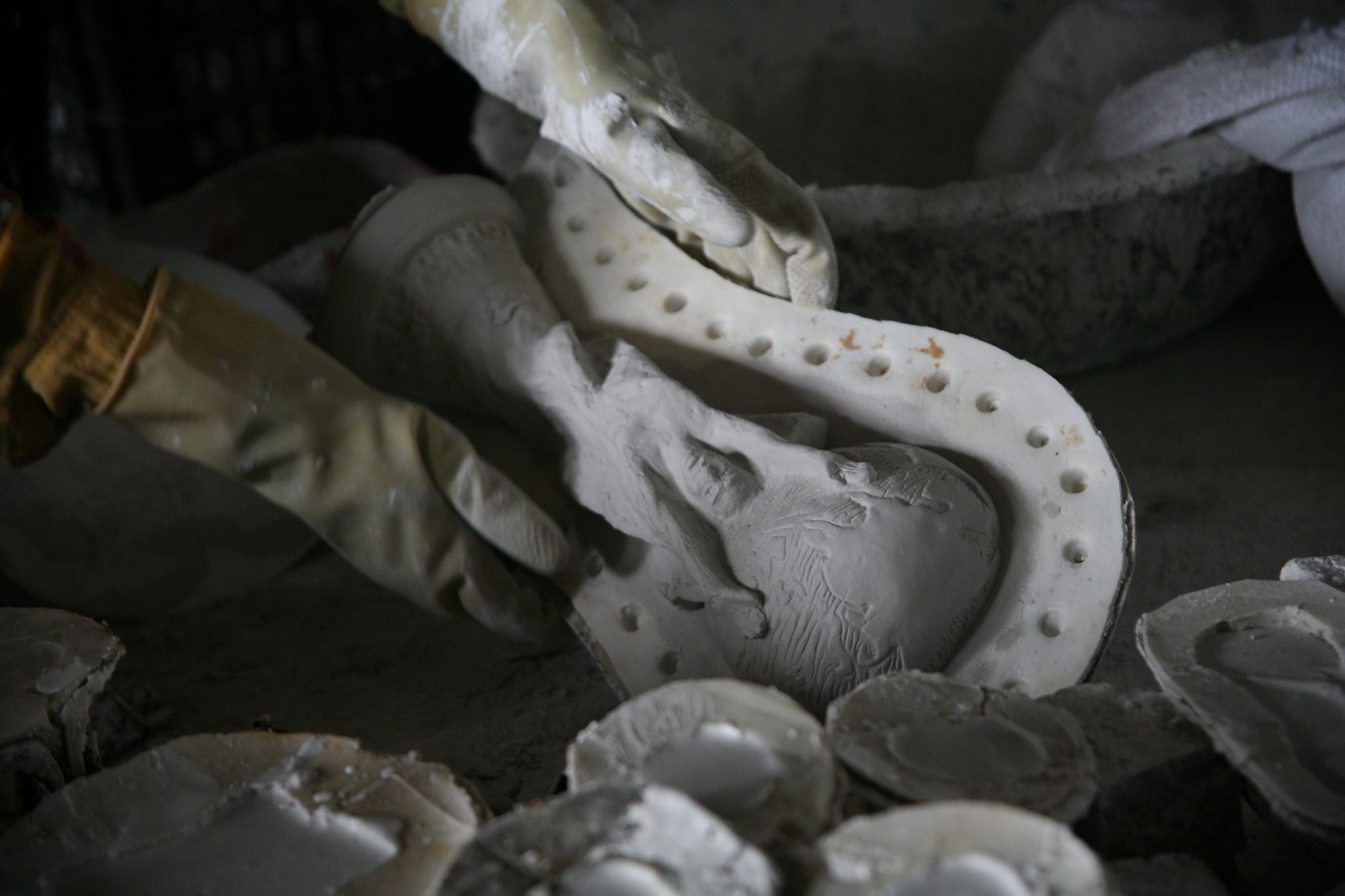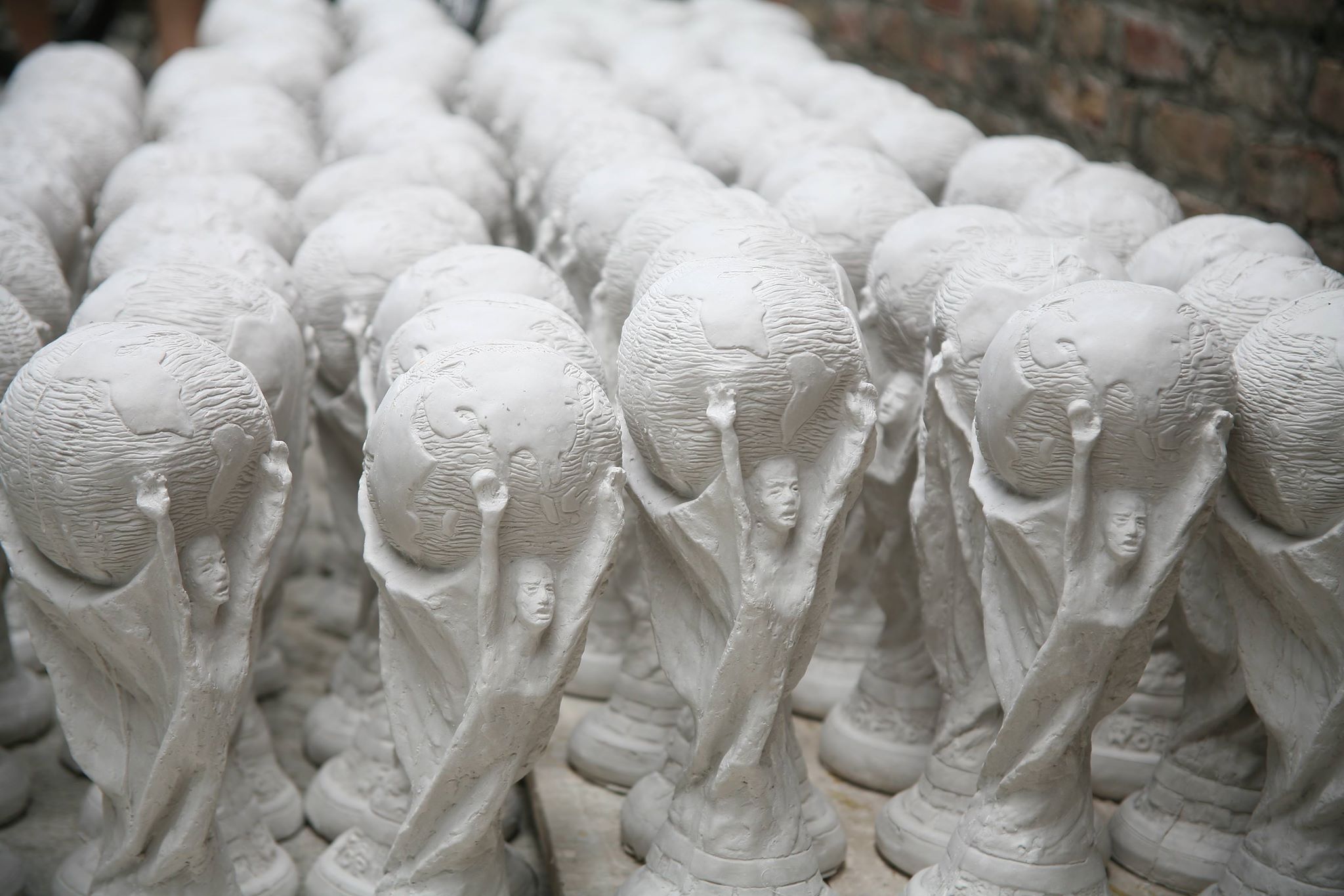 Nguyên liệu thạch cao được trộn với nước với tỷ lệ chuẩn xác, không được nhão cũng không được đặc quá. Sau khi đổ nguyên liệu vào khuôn, phải lắc kỹ thuật để nguyên liệu tráng đều bề mặt khuôn, công đoạn này lặp lại 2 lần mới ra sản phẩm. Những chiếc cúp có hình dáng và tỷ lệ kích cỡ là gần như chuẩn 100%.