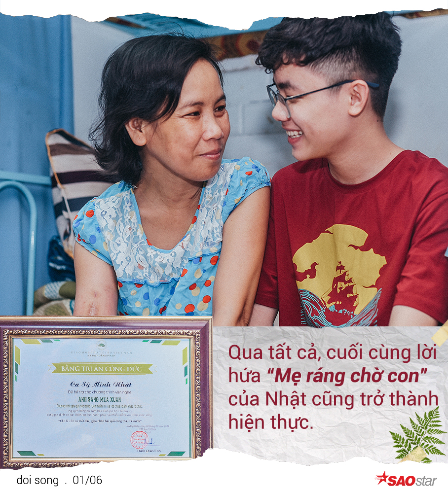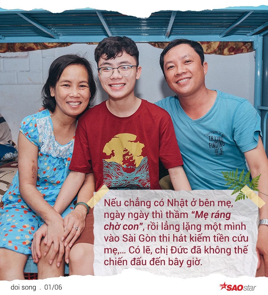 Giờ đây, tuy chị Đức không thể đi lại, đôi tay chằn chịt vết kim, sưng phồng vì vỡ van sau những đợt truyền thuốc… nhưng điều hạnh phúc to hơn cả mà chị nhận lại đươc, rằng cái lời hứa ‘Mẹ ơi! Ráng chờ con’ mà Nhật thì thầm với mẹ mỗi ngày, cuối cùng cũng trở thành hiện thực.