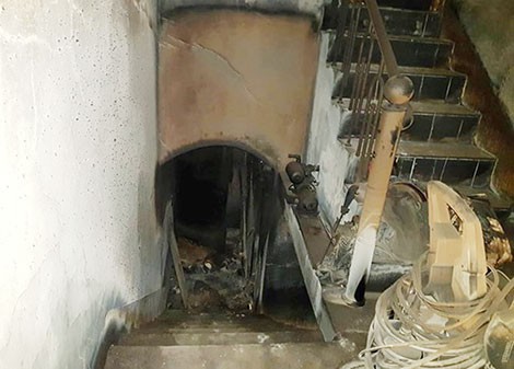 Dưới ánh đèn pin chiếu rọi, chúng tôi theo trinh sát đi sâu vào căn hầm, mùi khét lẹt, hơi nóng bốc ra từ những đồ vật bị cháy khiến không khí đặc quánh, khó thở.