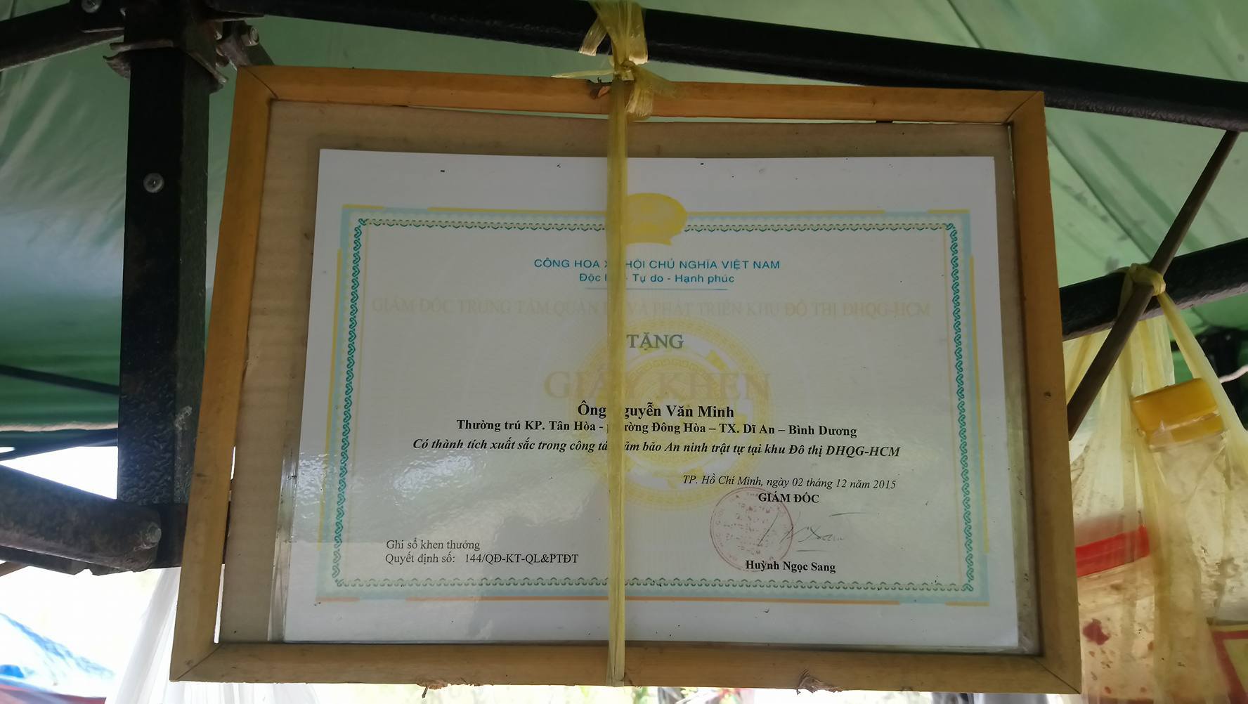 Nhờ chiến tích “săn bắt cướp”, ông Minh “cô đơn” được Trung tâm quản lý và phát triển khu đô thị Đại học quốc gia TP.HCM trao giấy khen tuyên dương.
