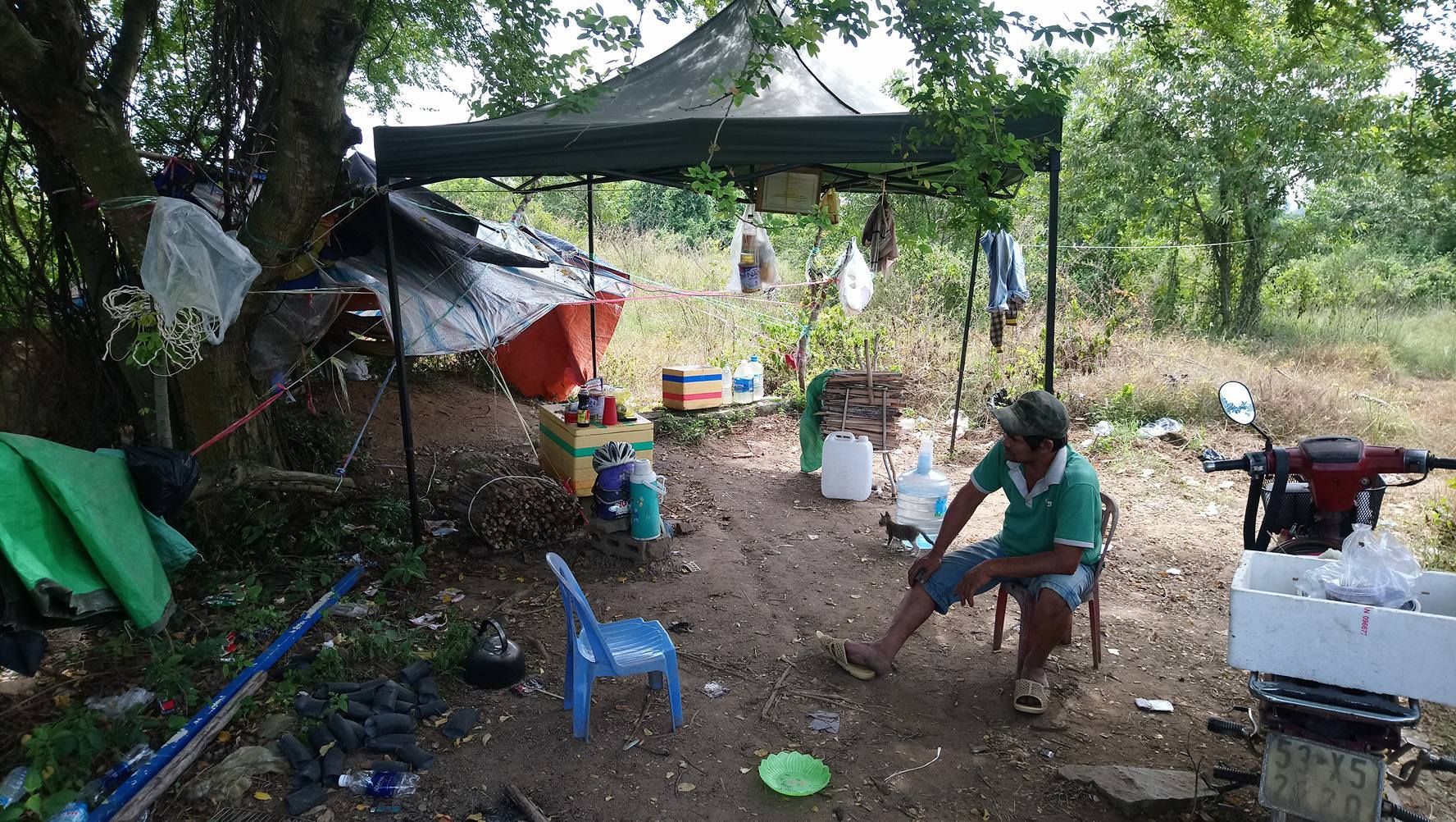 Nơi ở ông Minh “cô đơn” là căn lều, gọi là lều nhưng thực chất chỉ là tấm bạt che mưa, che gió ở giữa khu rừng tràm trên một đỉnh đồi hoang vắng tại Làng Đại học Thủ Đức. Gần đây, thấy thương cảm, một “đồng nghiệp” ở Câu lạc bộ phòng chống tội phạm TX.Dĩ An, Bình Dương tặng ông Minh “cô đơn” một cái lều dạng hình trụ.