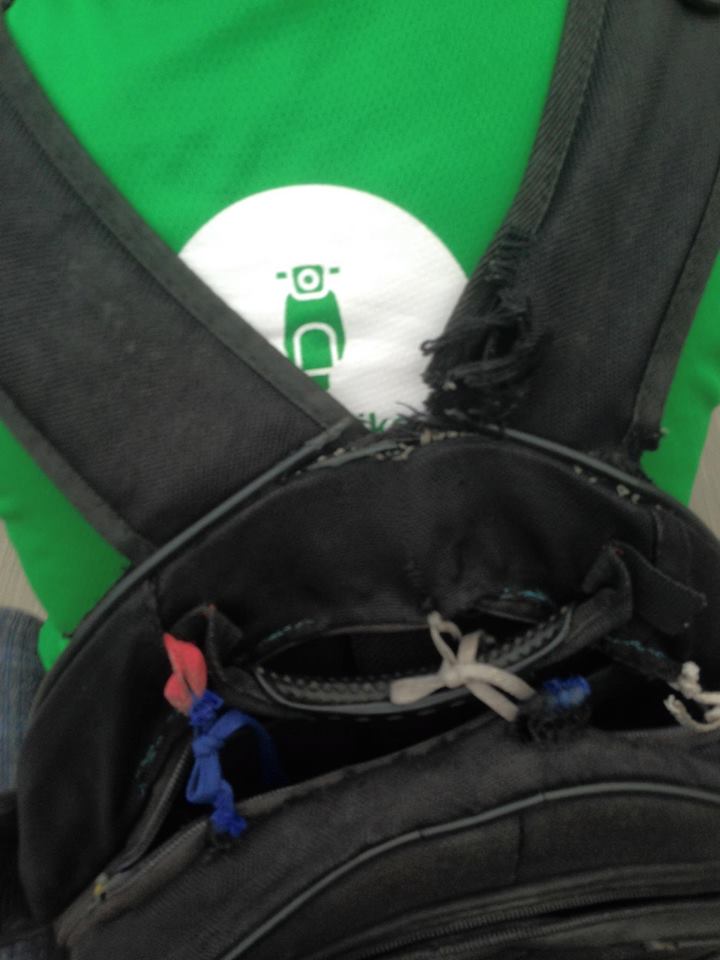 Chiếc balo đã sờn rách, được buộc lại chằng chịt những sợi dây.