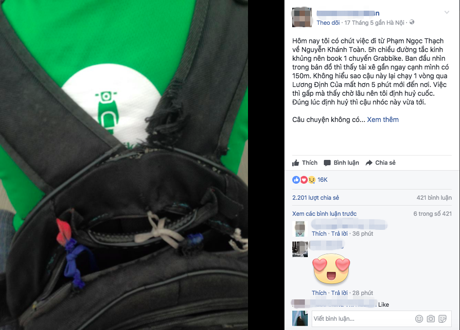 “Hôm nay tôi có chút việc đi từ Phạm Ngọc Thạch về Nguyễn Khánh Toàn. 5h chiều đường tắc kinh khủng nên book 1 chuyến Grabbike. Ban đầu nhìn trong bản đồ thì thấy tài xế gần ngay cạnh mình có 150m. Không hiểu sao cậu này lại chạy 1 vòng qua Lương Định Của mất hơn 5 phút mới đến nơi. Việc thì gấp mà thấy chờ lâu nên tôi định huỷ cuốc. Đúng lúc định huỷ thì cậu nhóc này vừa tới.