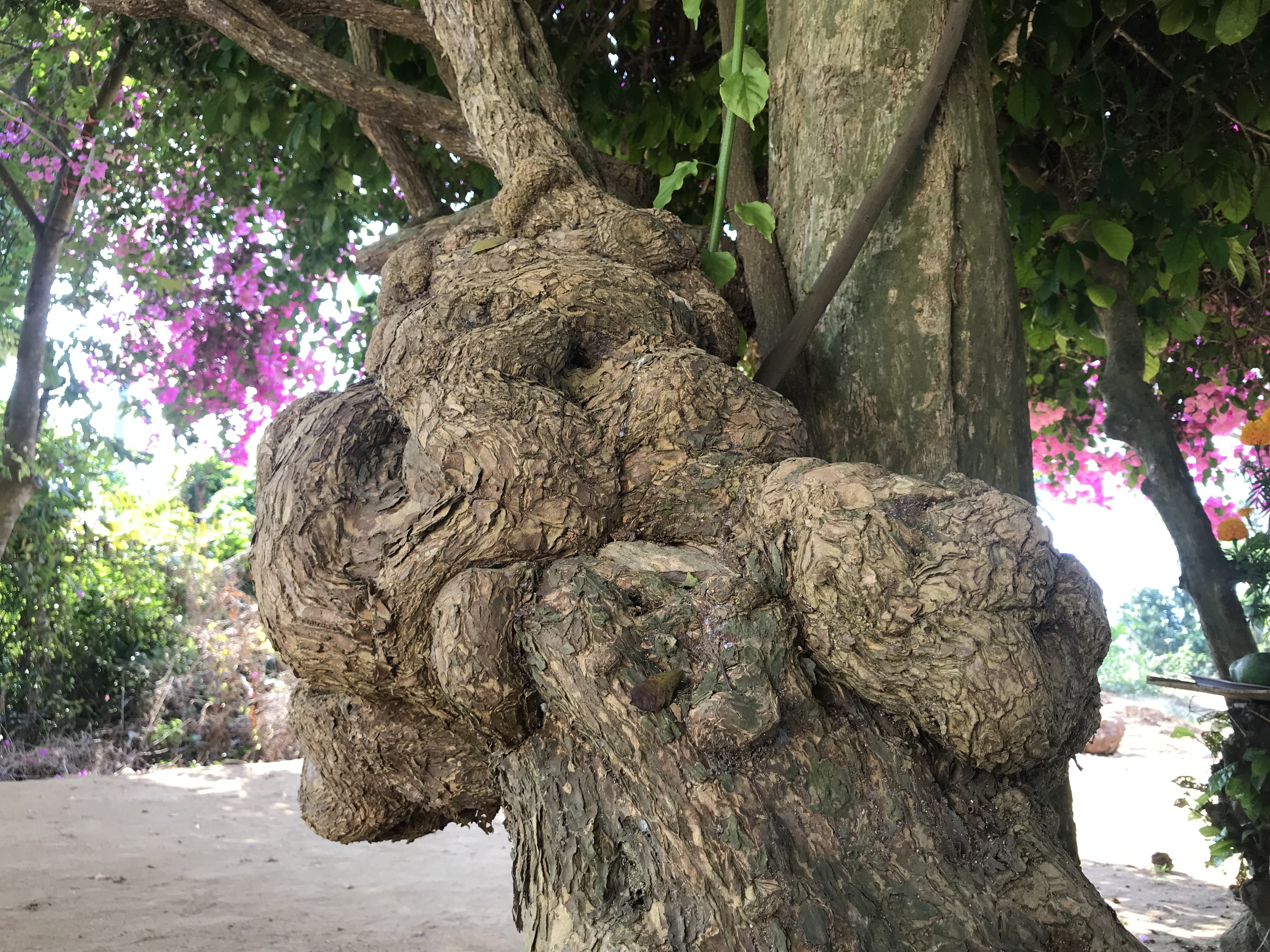 Cây hoa giấy có chiều cao hơn 7 mét, tán tròn và rộng che phủ góc sân vườn. Vì là cây có tuổi thọ trên 50 năm nên gốc to và xù xì