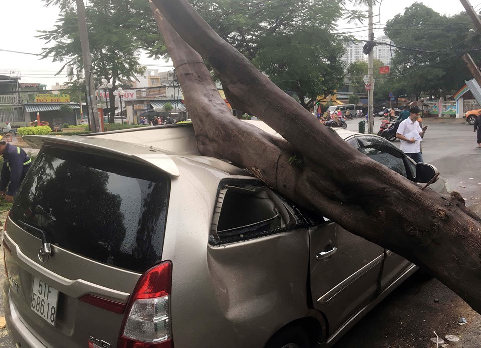 Một xe ô tô đậu trên đường bị cây đổ, đè khiến xe hư hỏng. “Lúc đó tôi đang ngồi trong xe đợi khách thì bỗng cây đổ ầm xuống. Tôi hoảng quá bung cửa xe tháo chạy ra ngoài, nhiều người đi xe máy cũng la hét, tháo chạy trong hoảng sợ”, tài xế xe ô tô kể.