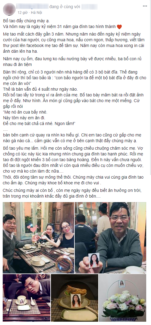 Tài khoản P.T.L tâm sự: “Bố mình đấy mọi người ạ! Và hôm nay là ngày kỷ niệm 31 năm gia đình mình hình thành. Mẹ mình mất cách đây gần 3 năm, nhưng năm nào đến ngày kỷ niệm ngày cưới của hai người, bố cũng mua hoa, nấu cơm ngon, thắp hương và viết post tâm sự lên facebook mẹ mình. Năm nay, bố còn mua hoa xong in ảnh dán lên.