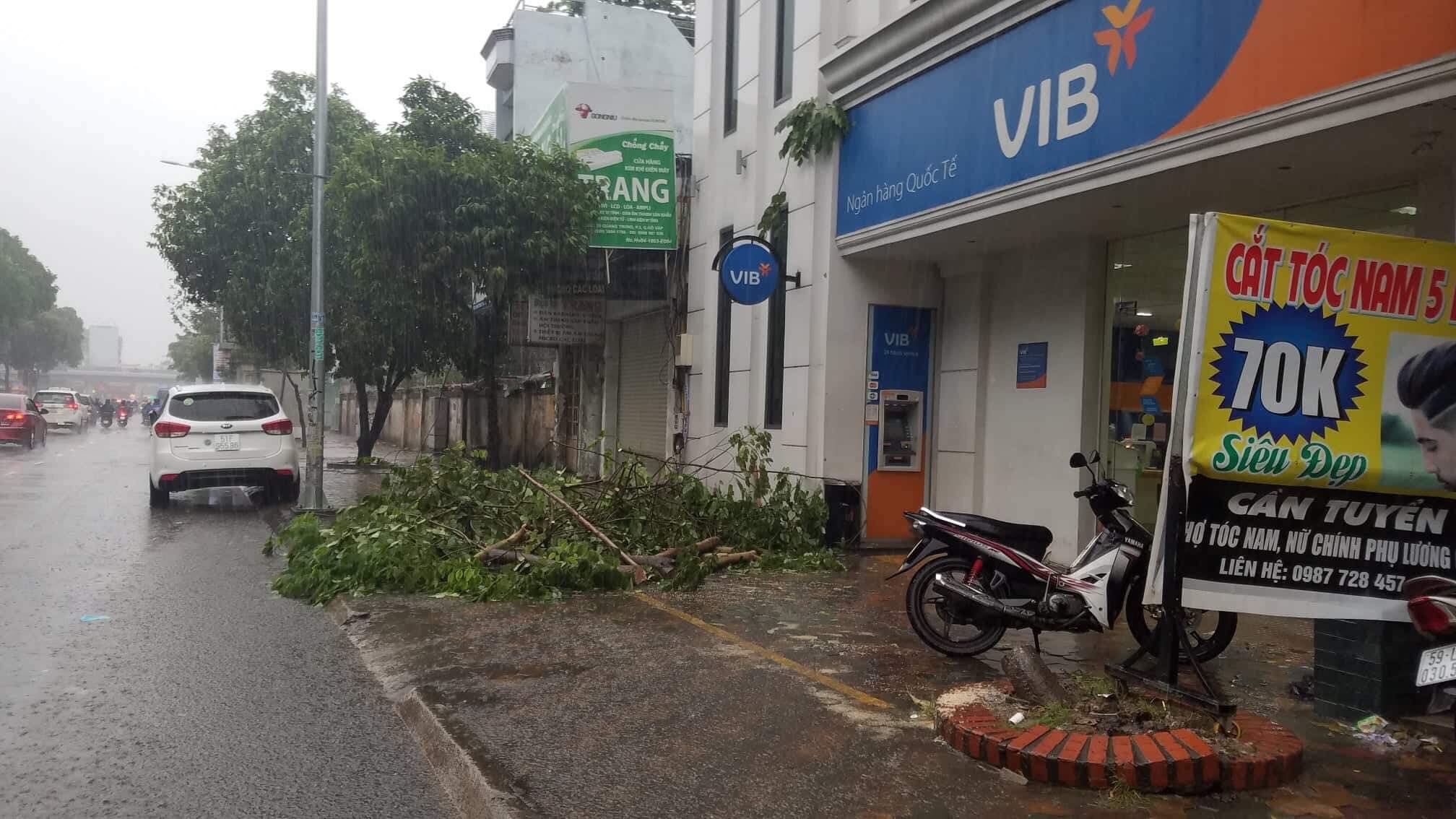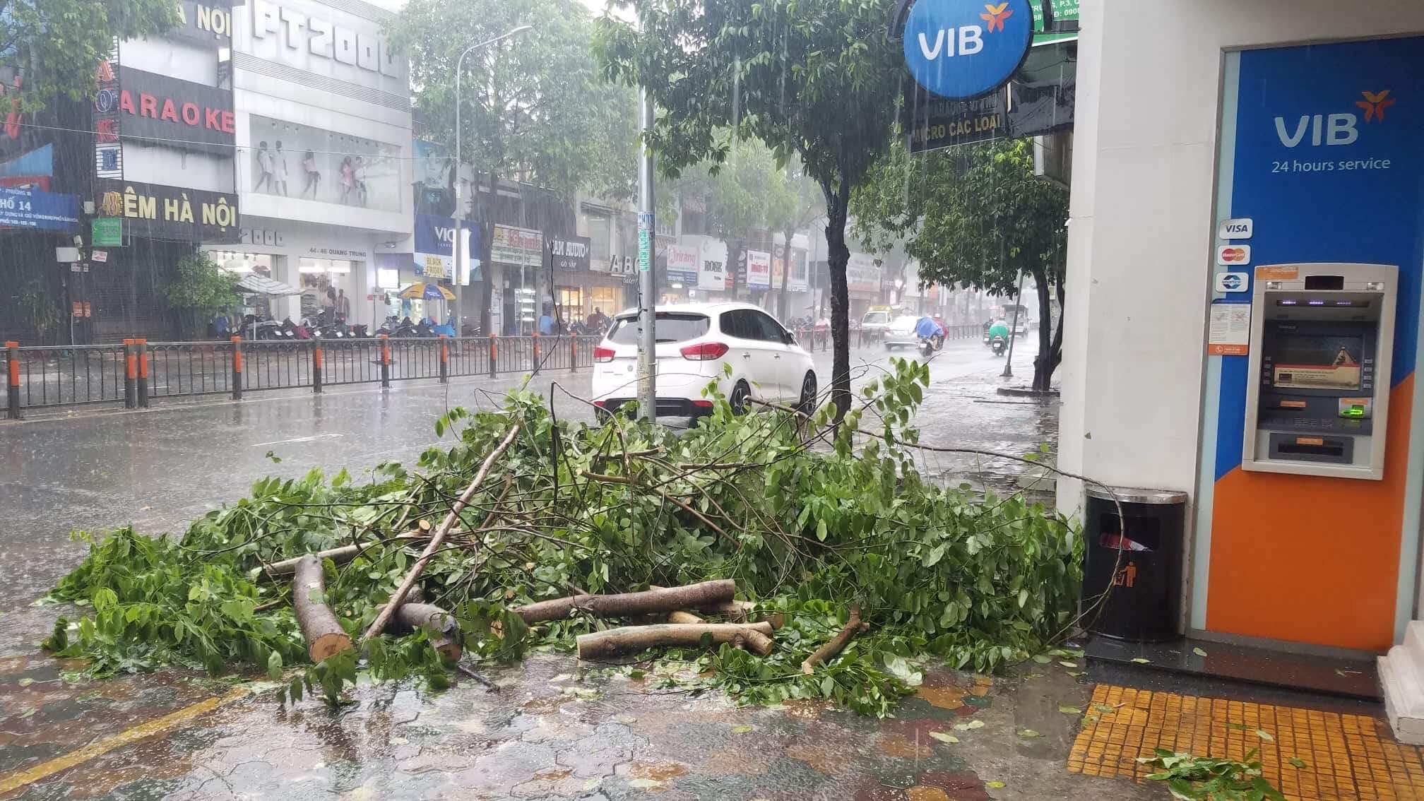 Khoảng 2h chiều 25/11, một cây xanh trước ngân hàng VIB trên đường Quang Trung (phường 10, quận Gò Vấp, TP. HCM) bất ngờ ngã đổ do ảnh hưởng của bão số 9.