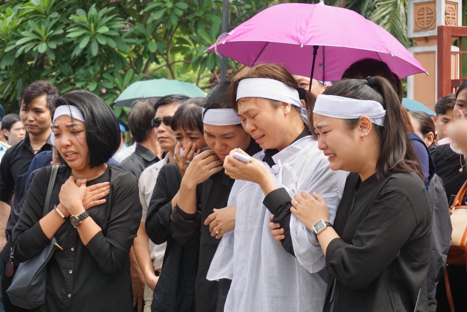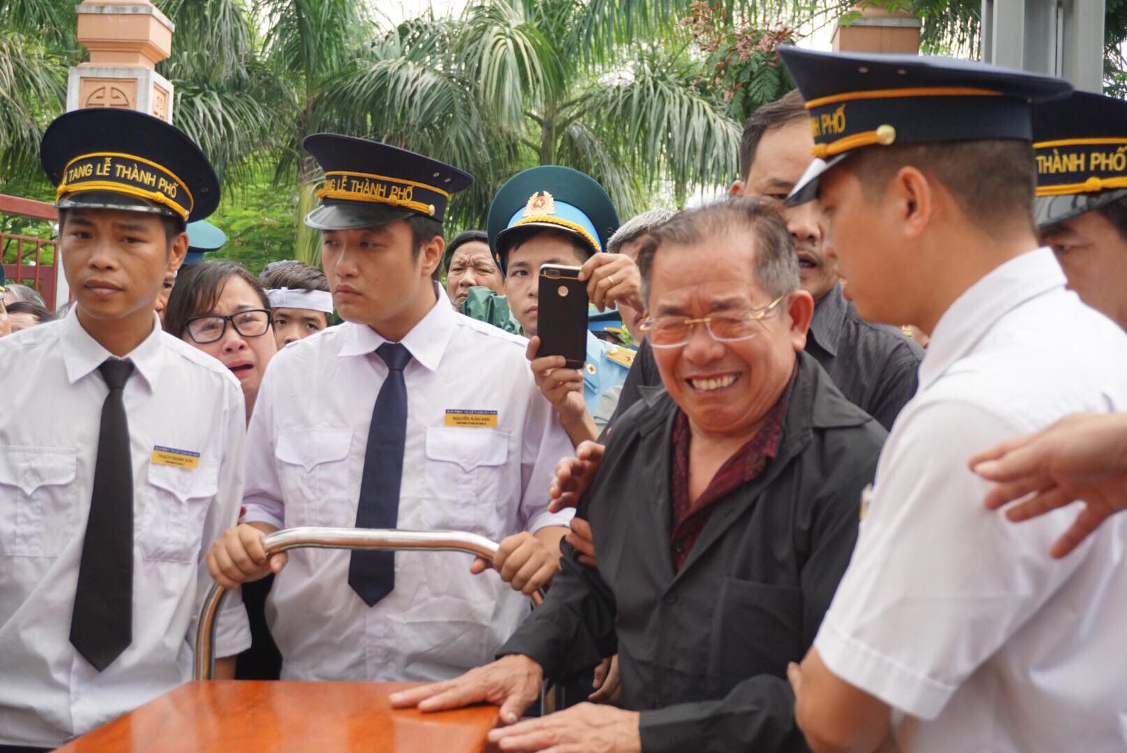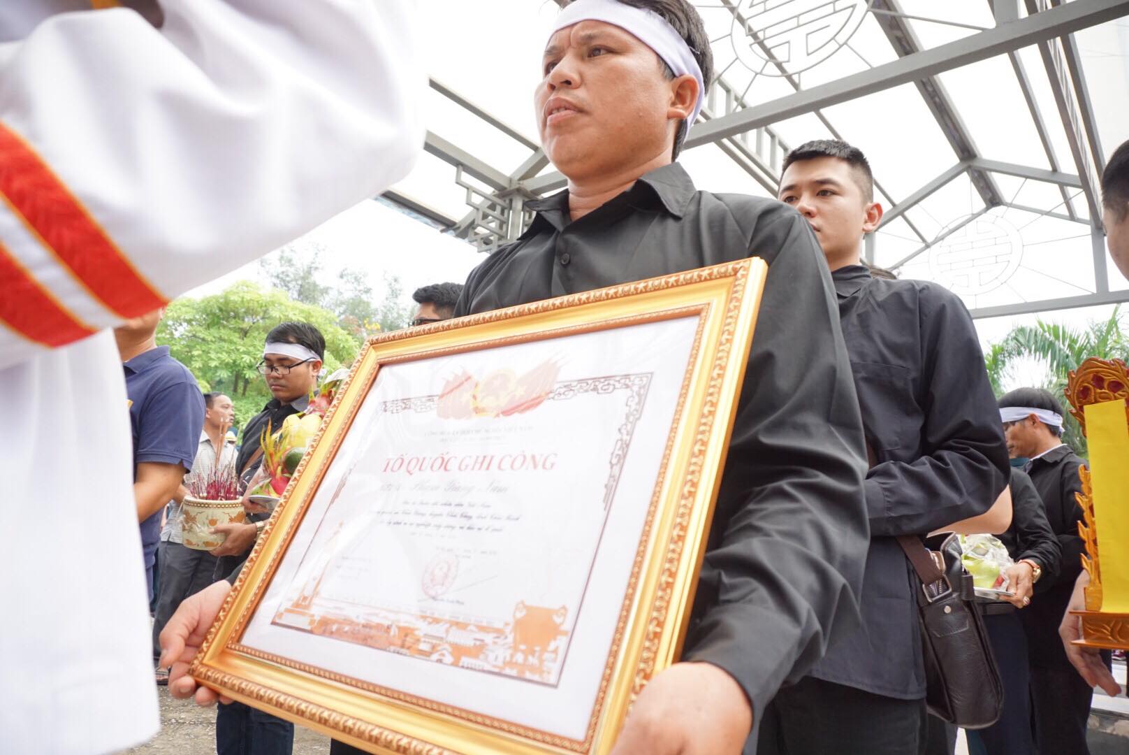 Cũng chung nỗi đau, ông Mỹ, bố đẻ chiến sĩ Phạm Giang Nam cùng vợ anh không đứng vững, chị được người thân dìu vào trong nhà tang lễ.