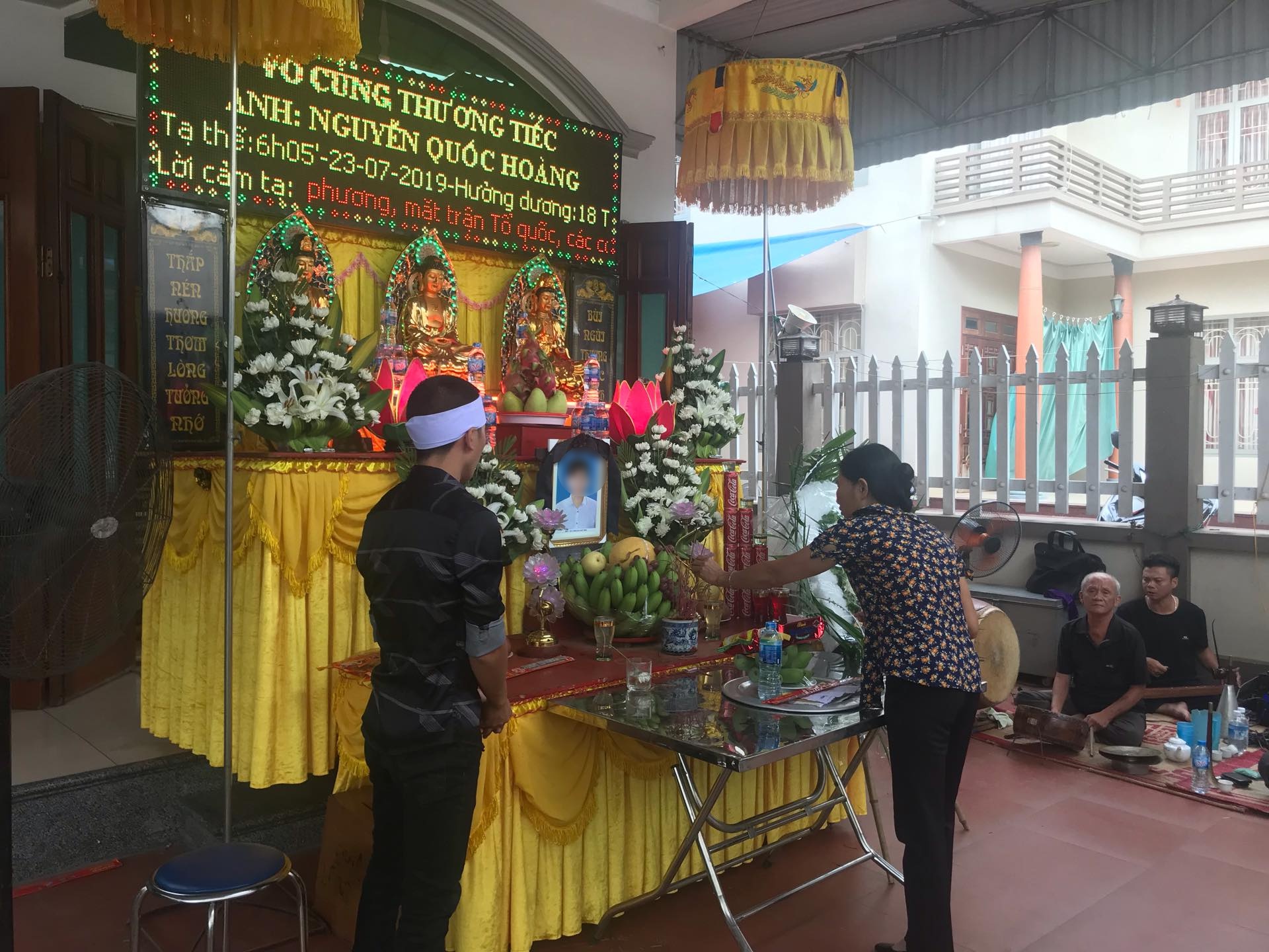 Tại gia đình em Nguyễn Quốc Hoàng (SN 2002, đang chuẩn bị lên lớp 12) nhiều bạn bè cùng người dân lặng lẽ đến viếng. Mới sáng nay, Hoàng còn đi xe máy để tới lớp học nhưng đó cũng là buổi học dang dở của nam sinh này.