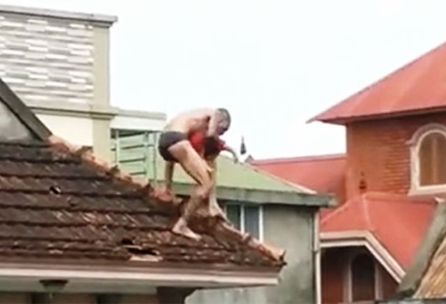 Người cha ôm con trèo trên nóc nhà