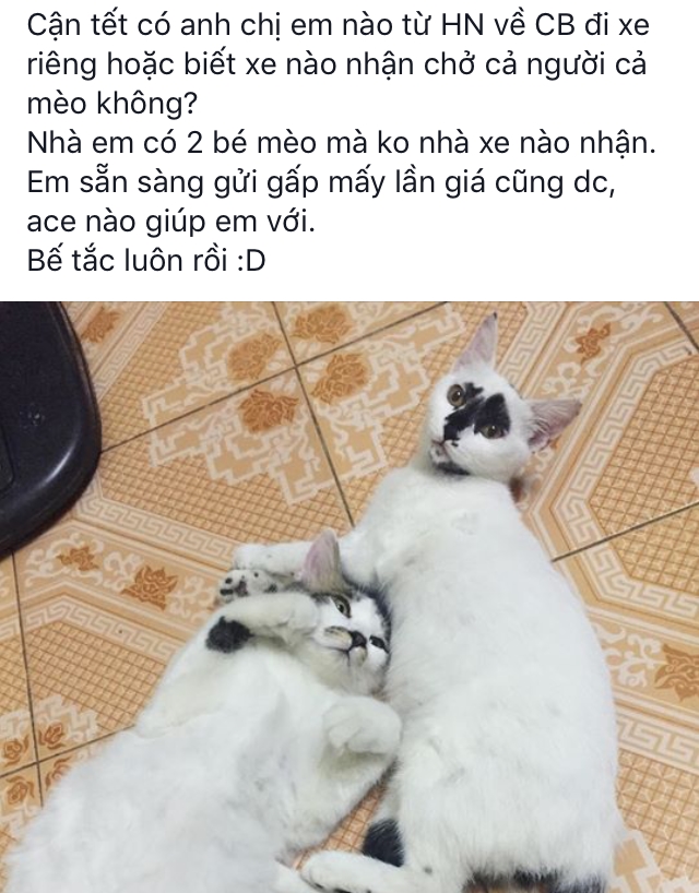 Câu chuyện được chia sẻ bởi chàng trai có tên là Phúc Đạt (sinh năm 1992, quê Cao Bằng) kể về hành trình đưa 2 mèo cưng về quê ăn Tết khiền nhiều người chú ý. Theo đó, vì lo lắng không có ai chăm sóc cho mèo cưng nên Đạt đã quyết định đưa cả 2 về quê ăn Tết. Tuy nhiên, dù đã cố gắng liên hệ với hơn 30 hãng xe nhưng tất cả đều chối từ.