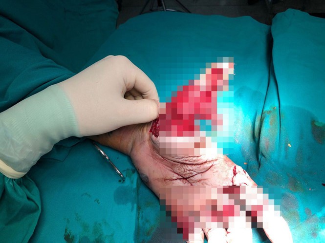 Tại BV Chấn thương chỉnh hình TP.HCM, các bác sĩ cho biết cơ và mô bàn tay trái bệnh nhân bị dập nát nhiều, tái nhợt, đứt 2 động mạch, mất da nhiều nơi cả bàn tay…