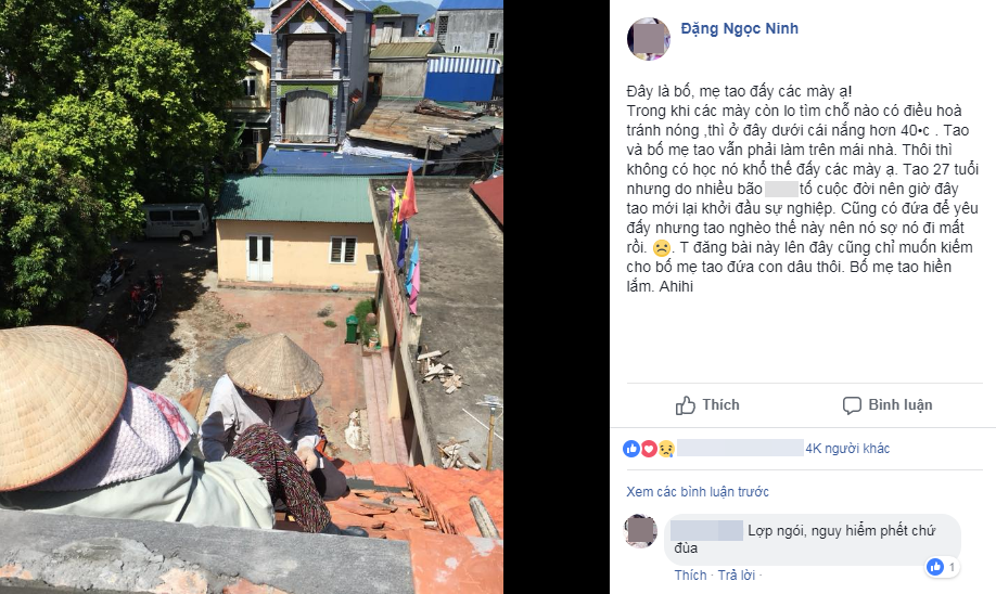 Chỉ là 1 phút nghỉ tay dưới cái nắng cháy da cháy thịt, chàng trai trẻ đã kịp khiến nhiều người chạnh lòng khi nhìn thấy bố mẹ anh lặng thầm xếp gạch trên mái nhà nóng như rang. Đâu đó thấy họ rất giống bố mẹ chúng ta, cũng đã từng lam lũ nhọc mệt không quản nắng mưa như thế vì cuộc sống mưu sinh.