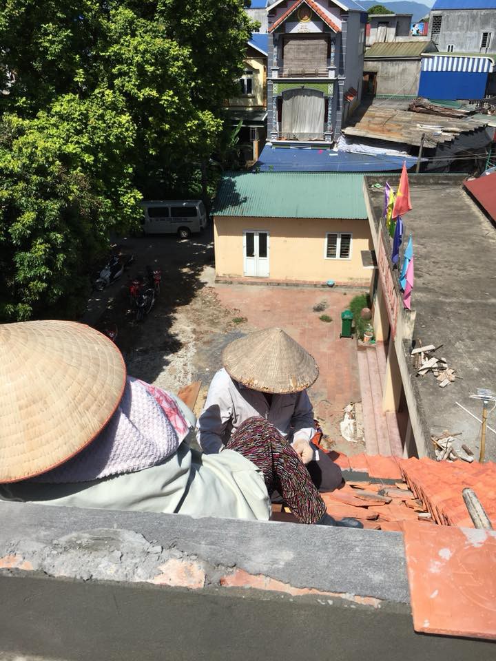 Nhìn ảnh thôi đã muốn hoa cả mắt, vậy mà đôi vợ chồng trung niên vẫn miệt mài lợp ngói.
