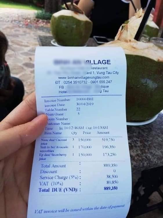 Cụ thể hơn, giá một trái dừa là 150 ngàn đồng bằng ly nước ép dâu, còn ly sinh tố bơ giá 170 ngàn đồng. Do hóa đơn gồm VAT 10% và phí phục vụ 5% nên 5 vị khách phải trả gần 890 ngàn đồng cho 3 trái dừa, 1 ly sinh tố bơ và 1 ly nước ép dâu.