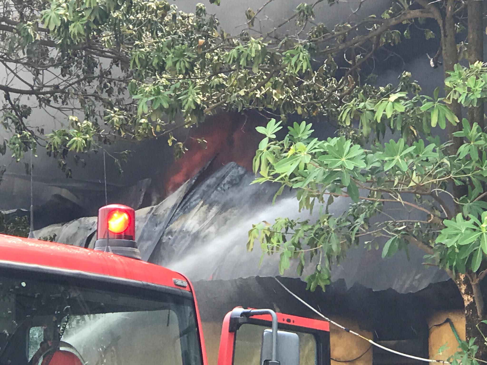 Một góc công ty mái tôn bị sức nóng của hỏa hoạn làm hư hỏng.