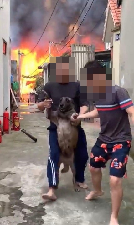 Người dân vội vã đưa thú cưng ra ngoài khi đám cháy đang ngun ngút phía sau.