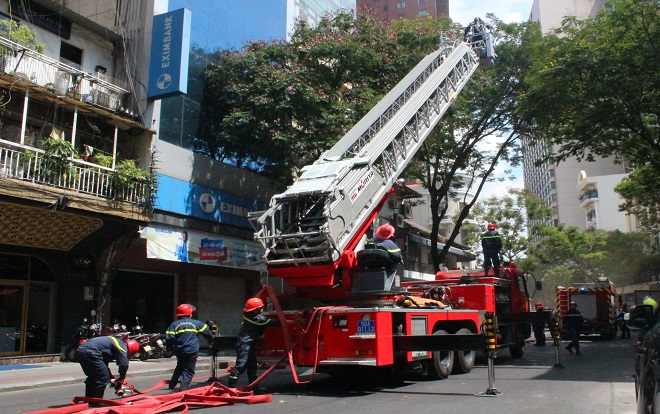 Công an quận 1 điều động 7 xe cứu hỏa và hàng chục chiến sĩ PCCC đến khống chế ngọn lửa.