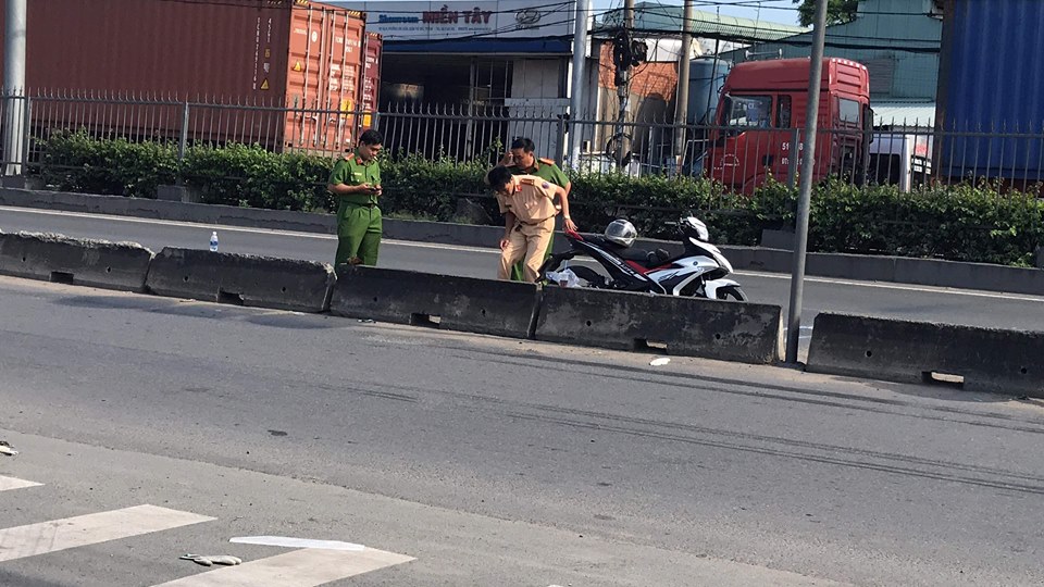 Đến 9h sáng 26/9, Công an quận Thủ Đức mới khám nghiệm xong hiện trường, điều tra nguyên nhân vụ tai nạn giao thông xảy ra giữa xe máy và container khiến 2 người nguy kịch.