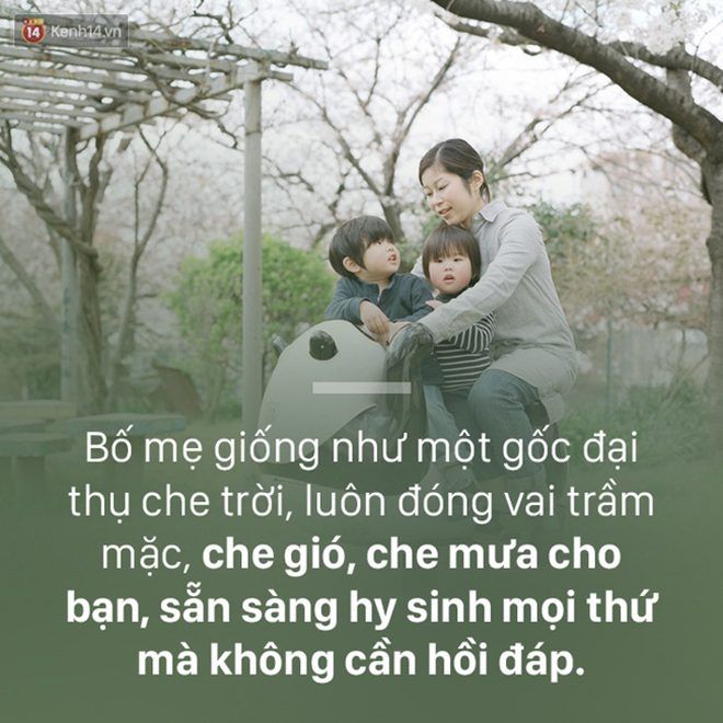 7. Bị ốm, không dám nói cho bạn biết, vì sợ làm ảnh hưởng tới việc học của bạn. Nhớ bạn, không dám gọi điện thoại cho bạn, vì sợ làm ảnh hưởng tới công việc của bạn. Bố mẹ có thể cả năm không mua lấy một bộ quần áo mới, nhưng sẵn sàng mua những thứ tốt nhất cho bạn. Trời lạnh, người đầu tiên họ nghĩ tới sẽ là bạn, đứa con đang vất vả làm việc ở phương xa. Bố mẹ giống như một gốc đại thụ che trời, luôn đóng vai trầm mặc, che gió, che mưa cho bạn, sẵn sàng hy sinh mọi thứ mà không cần hồi đáp.