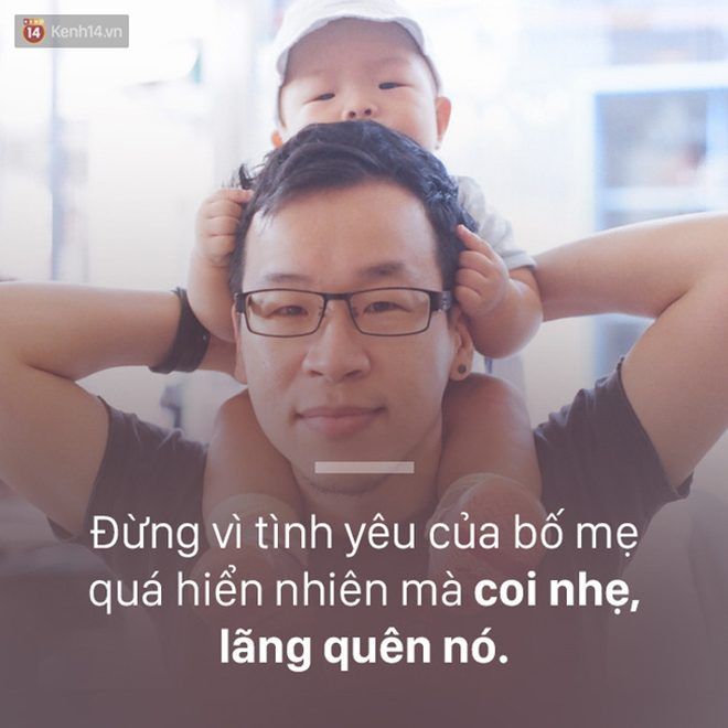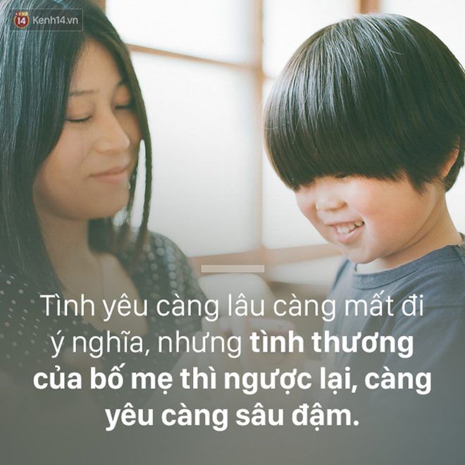9. Mỗi việc bố mẹ làm cho bạn đều không thể đổi được bằng tiền bạc, nếu cảm động bạn không thể diễn đạt hết bằng lời, vậy hãy ghi nhớ nó trong lòng cả đời. Thứ tình cảm này rất bình thản, vì nó đã sớm ngấm vào máu thịt, sống chết cũng không rời xa. Đừng vì nó là thói quen mà coi nhẹ, đừng vì nó quá hiển nhiên mà quên dần đi.