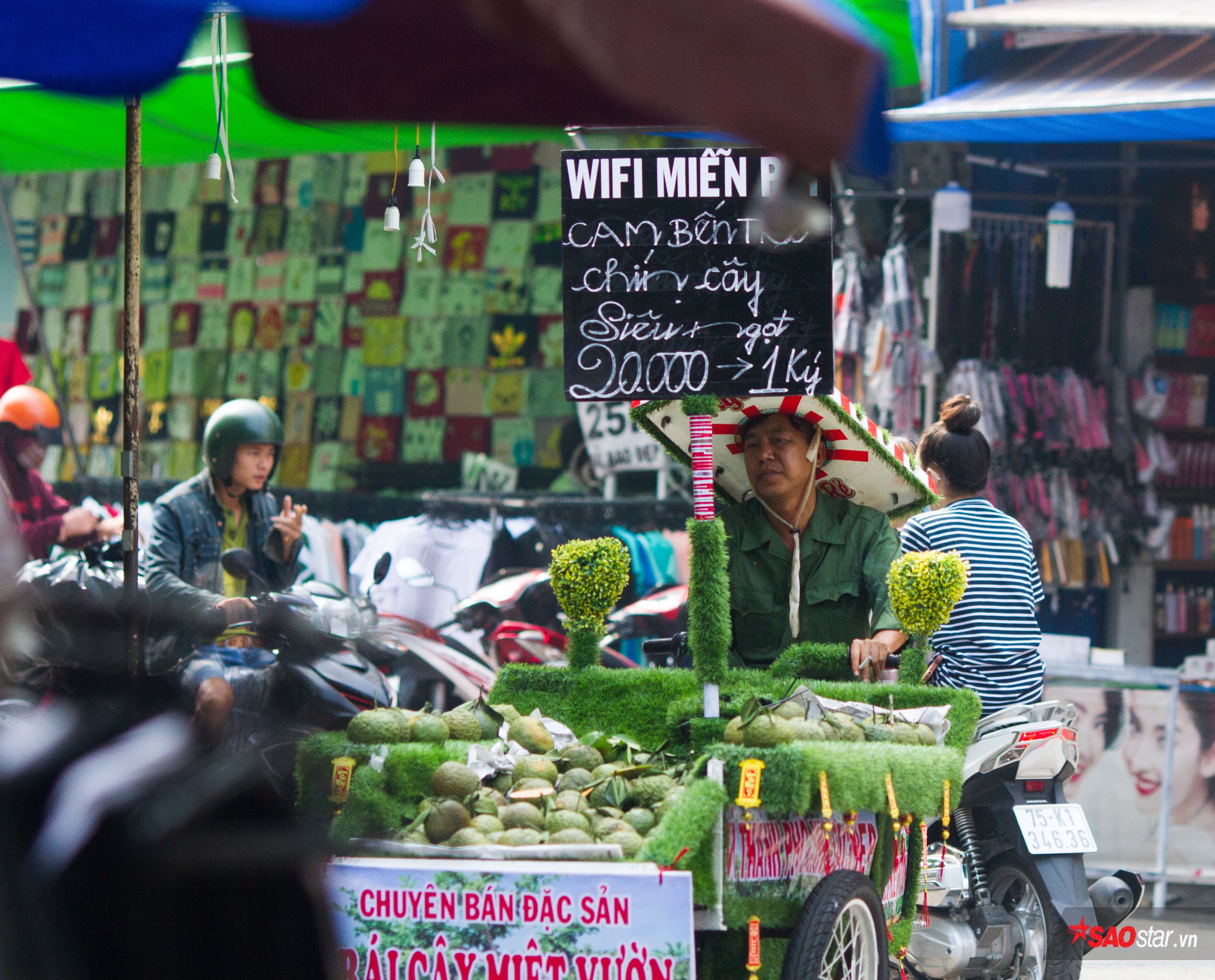 Không chỉ gây ấn tượng bởi chiếc xe màu xanh, chiếc mũ tự chế bằng thùng xốp mà người mua hàng còn thích thú bởi hàng chữ “wifi miễn phí” cùng dàn nhạc được gắn trên xe .