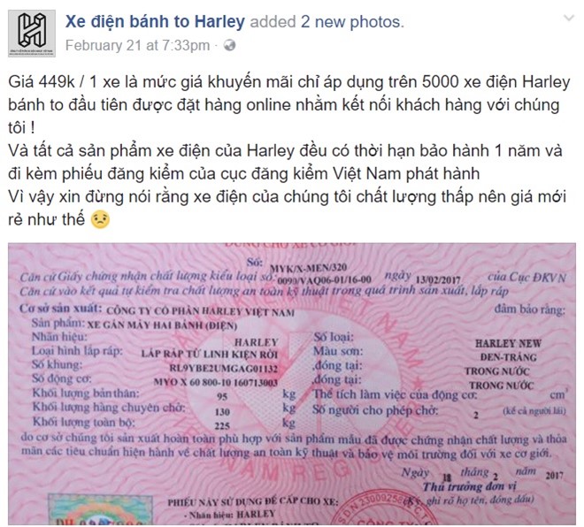 Trước đó, trang Facebook này rao bán 5.000 chiếc xe điện giá khuyến mại 499.000 đồng. Tuy nhiên, sau đó số xe được nâng lên 30.000 chiếc khi đơn vị trên nhận được công văn “chính thức cho phép Công ty cổ phần Harley Việt Nam mở chương trình khuyến mại tại thị trường Việt Nam” được cho là do Cục xúc tiến Thương mại, Bộ Công Thương mà đại diện là Phó cục trưởng Lê Hoàng Tài ký xác nhận.