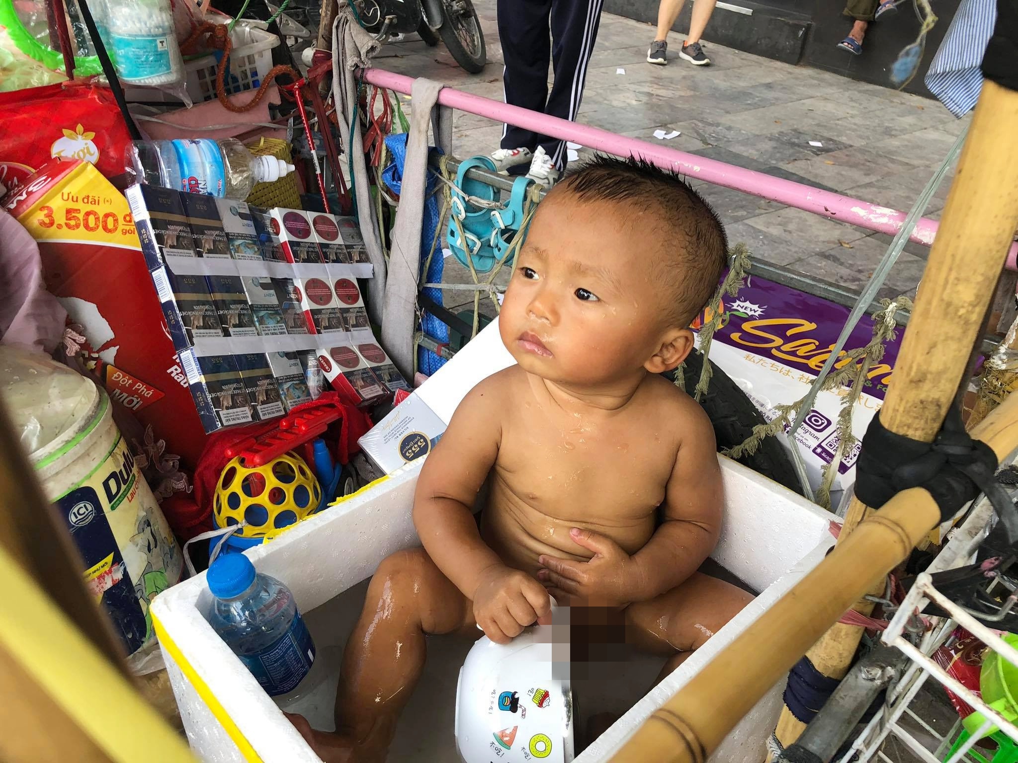 Hình ảnh cháu bé ngồi trong thùng xốp đựng nước giữa nắng nóng khiến nhiều người quan tâm.