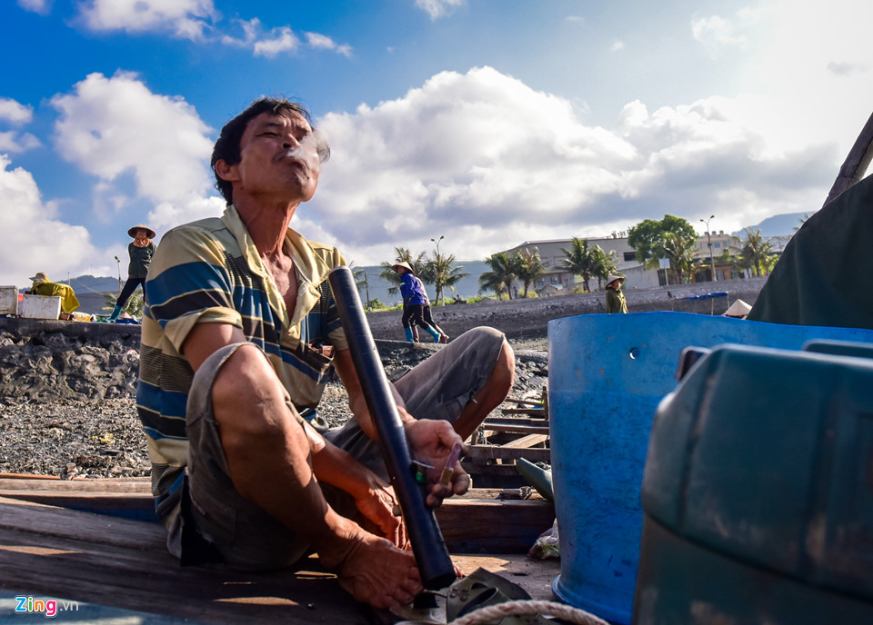 Trong lúc những người phụ nữ bận rộn mua bán thì những người đàn ông tranh thủ xả hơi. Ông Nhung (55 tuổi) cho biết mỗi ngày đều ra khơi từ 11h đêm đến 3-4h sáng. Tàu đi xa khoảng 30 hải lý, đánh bắt các loại cá mòi, cá ót rồi chuyển vào chợ bán. Công việc không mang lại thu nhập quá cao nhưng cũng đủ giúp ông nuôi 3 người con ăn học trưởng thành.
