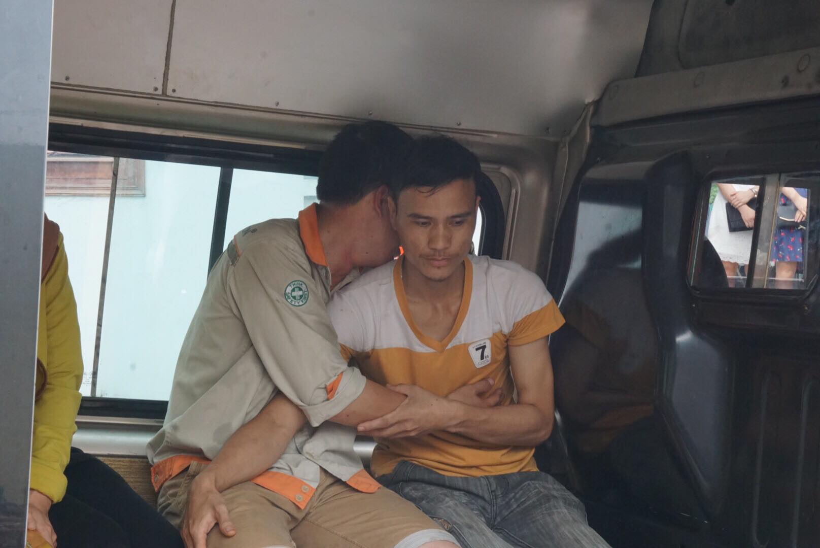 Thi hài ba mẹ con tội nghiệp được đưa lên xe ô tô chuẩn bị đưa về quê nhà. Anh Hoàng ôm di ảnh vợ con rồi bật khóc. Trên cơ thể anh có nhiều vết xây xát sau tai nạn sáng nay.