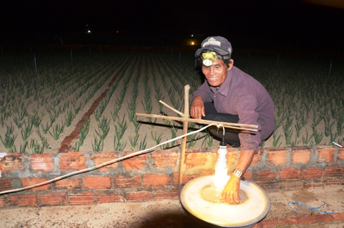 Ông Nguyễn Ân, trồng hai sào hành cho biết phải giăng 7 bóng điện thắp sáng ruộng hành dù mưa hay nắng. “Có bướm thì mình bật điện lên để đỡ tiền thuốc sâu”, ông nói. Còn ông Lắm, người trồng 10 sào hành thì phải giăng gần 40 bóng điện.
