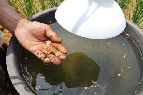 Ông Nguyên trộn nước rửa chén vào thau nước dưới đèn để bẫy bướm. Ảnh: Thạch Thảo.
