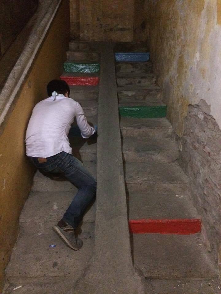Trong bức ảnh được đăng tải cùng câu chuyện thú vị, một người đàn ông trẻ đang “hì hụi” sơn đủ sắc: lam, xanh, đỏ…lên những bậc cầu thang đã rất cũ kĩ của khu tập thể.