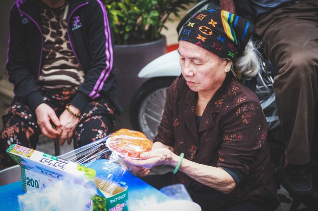 Cụ bà có “thâm niên” làm xôi lâu năm, cần mẫn ngồi gói từng đĩa xôi gấc đỏ hồng cho khách