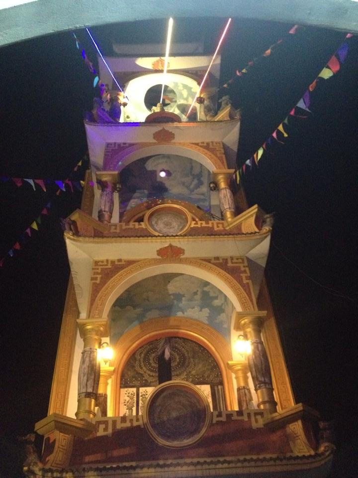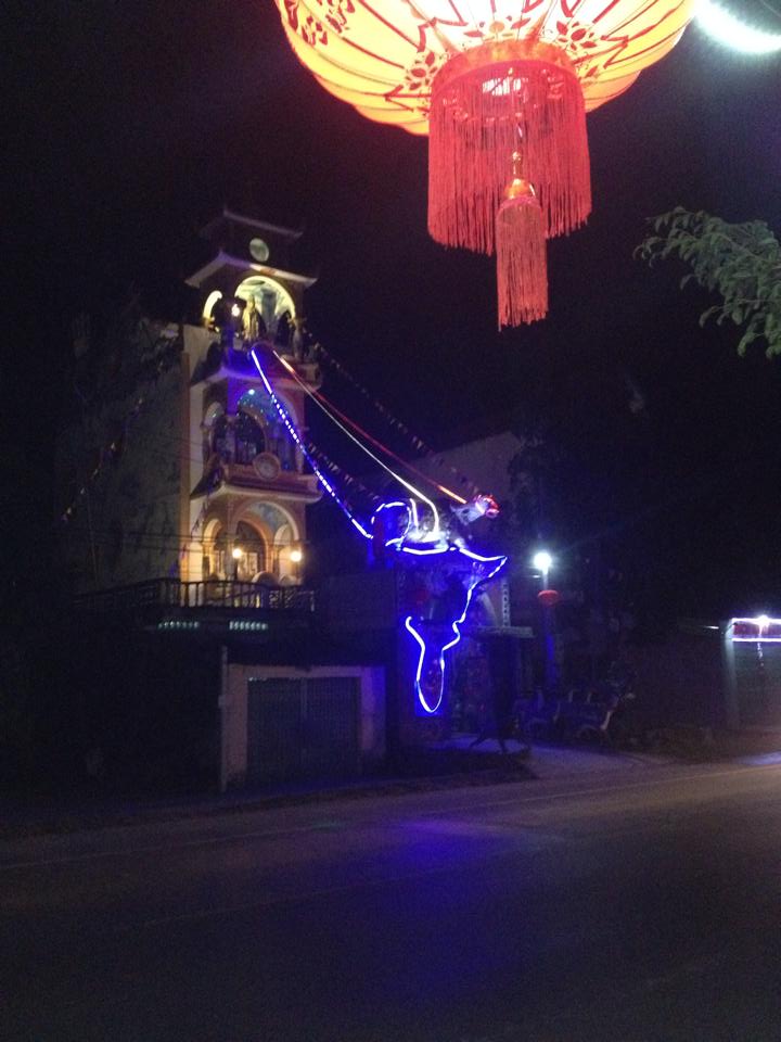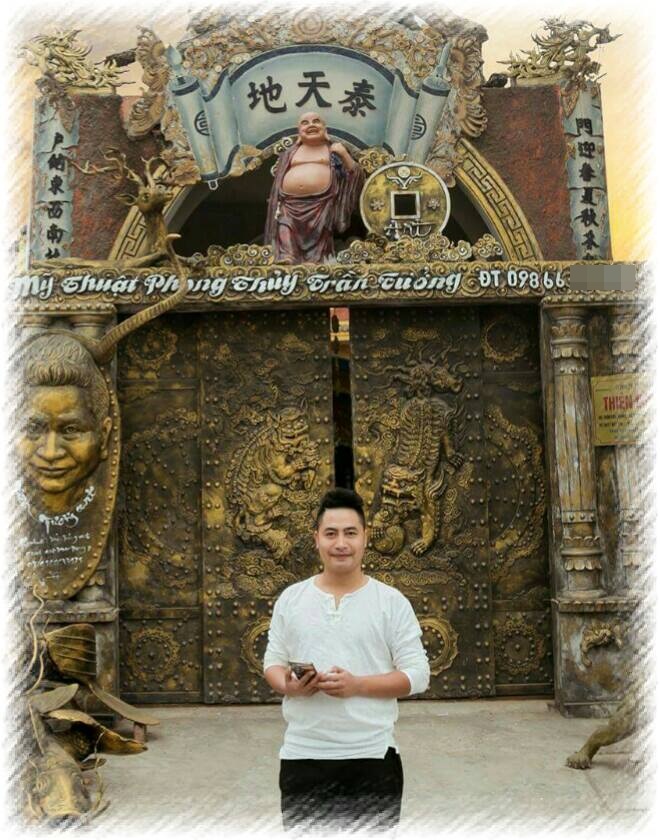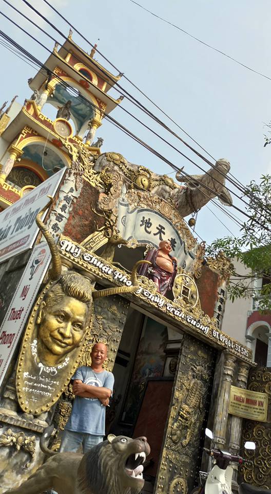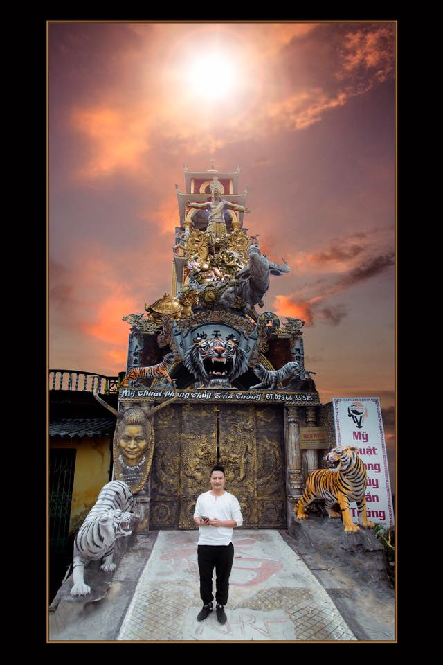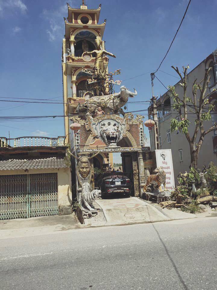 Căn nhà có lối kiến trúc hình ống quen thuộc, tuy nhiên cách trang trí lại khiến nhiều người không khỏi bất ngờ. Phần ban công và mái của ngôi biệt thự cong vút như mái chùa, tầng cao nhất đặt tượng Phật quang âm. Ngay trước cổng nhà là biểu tượng cá chép tượng trưng cho sự nỗ lực, ý chí kiên định; nóc nhà còn có một đàn ngựa ngụ ý “mã đáo thành công”. Một điểm nhấn khác là hình tượng trâu mặc áo giáp đồng khá to ngay trên cổng nhà để cầu mong cuộc sống ấm no hạnh phúc…