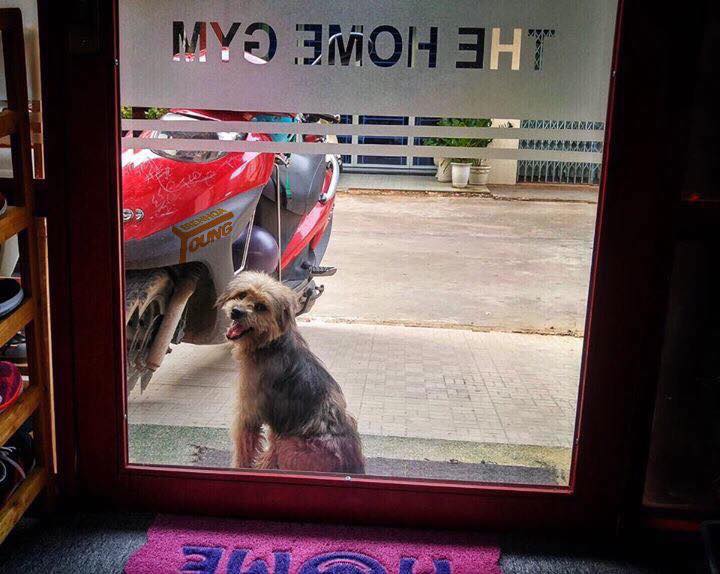 Khi phát hiện sự có mặt của chú chó trước của phòng gym, nhận viên ở đây đã cung cấp nước và đồ ăn chú chó trung thành này.