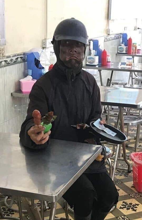 Vài ngày qua, mạng xã hội xôn xao trước những hình ảnh về người đàn ông ăn xin với dáng vẻ quái dị như: đi ủng, mặc quần áo đen, đội mũ bảo hiểm, bôi đen mặt, tay cầm đầu gà, xúc xích… cầm khay đi ăn xin tại nhiều địa điểm ở Hà Nội.