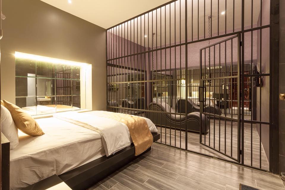 Hai phòng kết cấu và bài trí hình thức bạo lực. Trong đó,một phòng kết cấu ngăn bằng khung sắt sơn màu đen, có cửa khóa lại; Bên ngoài là giường ngủ, bên trong có hai sợi xích còng tay treo trên tầng nhà, một bức ảnh một người bị khóa tay bằng dây xích. Một phòng giường ngủ làm bằng song sắt 3 vách, có trang bị hình gỗ hình chữ X, có gắn 4 dây xích còng tay và chân. Về biển hiệu có trang trí 3 sao.