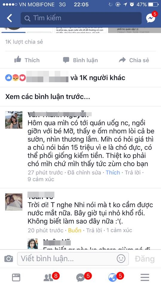 Tài khoản T.N. mong muốn: “Với những ai yêu thương thú cưng có thể giúp các em về một mái ấm tốt hơn. Bản thân tôi sẵn sàng trả tiền để đưa Mỡ về nhà, nhưng thái độ của chủ quán xem thường mình và chỉ muốn thu lợi nhuận từ chó, chứ không yêu chó”.