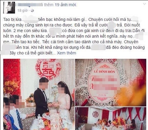 Mới đây, trên mạng xã hội xôn xao câu chuyện của một người đàn ông “tố” vợ sắp cưới của mình lừa tiền. Bài đăng đính kèm dòng trạng thái “não nề” cùng bộ ảnh chụp lễ ăn hỏi có sự chứng kiến của đông đảo người thân và bạn bè.