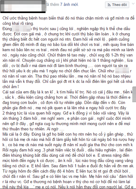 “Chuyện cũng chẳng có gì khi mình phát hiện anh ấy là một thằng nghiện. Lừa dối, công việc bị đuổi mà dám nói là đi làm bình thường. Tha thứ bao nhiêu lần rồi, mẹ anh ấy khuyên ngăn bao nhiêu lần rồi nhưng vẫn chứng nào tật nấy“, cô gái cho hay