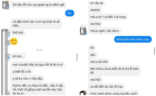 Cô gái tâm sự vì cảm thấy rất mệt mỏi nên quyết định trả lễ. “Ban đầu mẹ của anh ấy đồng ý vì biết anh ấy sai. Nhưng anh ấy không chịu, làm ầm lên nên gia đình tôi đi về. Mẹ anh ấy chạy theo bỏ lễ vào giỏ và nói: Con trai tôi không đồng ý.