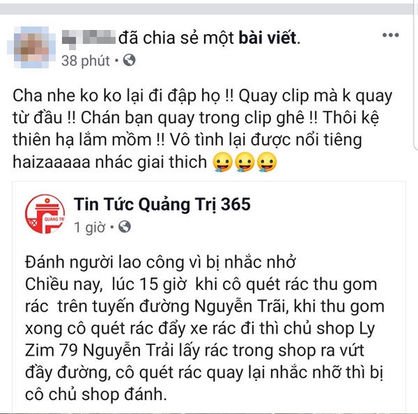 Theo đó, khoảng 15h ngày 19/5, khi đang quét dọn rác trên đoạn đường Nguyễn Trãi (TP. Đông Hà), chị Hoa thấy chủ shop thời trang Y.L. vứt rác bừa bãi ra đường nên nhắc nhở. Tuy nhiên, L. tiếp tục nhặt rác trên vỉa hè vứt ra đường nên chị Hoa nhắc nhở và hai bên xảy ra cự cãi, xô xát. Đoạn clip gây sự chú ý của cộng đồng mạng, phần đông bày tỏ sự phẫn nộ, bức xúc và kêu gọi tẩy chay shop thời trang của cô gái trong clip.