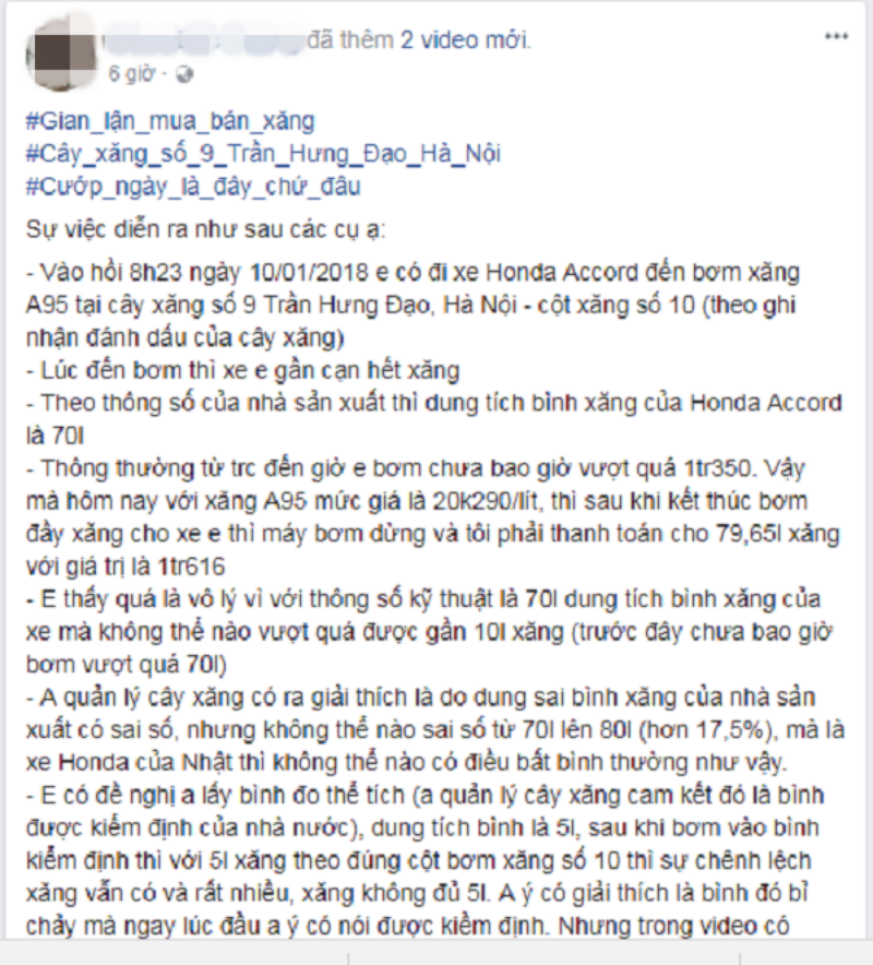 Theo đó, vào khoảng 8h23 sáng 10/01, anh T. điều khiển xe ô tô hiệu Honda Accord đến bơm xăng tại cây xăng số 9 Trần Hưng Đạo, Hà Nội. Theo anh T. cho biết, chiếc ô tô của anh có dung tích bình xăng là 70L (theo thông số từ nhà sản xuất), thông thường khi bơm xăng từ lúc bình sắp cạn đến khi đầy thì chưa bao giờ vượt quá 1,3 triệu đồng.