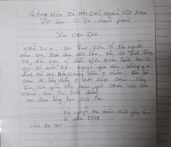 Lúc này, nhà chùa mở túi đồ của cháu bé thì thấy vài bộ quần áo kèm lá thư được viết ngắn gọn với nội dung: “Xin cho con… Em còn phải đi lấy chồng không nuôi được cháu…”.