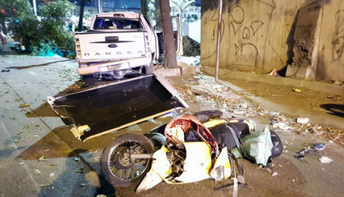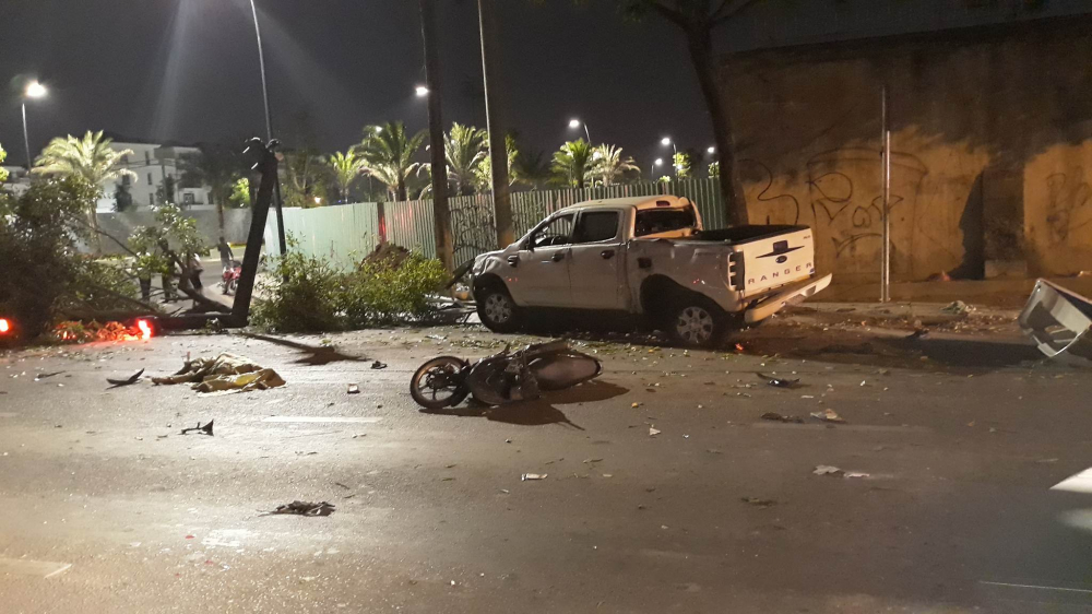 Xe máy nằm la liệt dưới đường, cây xanh và trụ đèn giao thông bị quật ngã sau cú tông mạnh của ô tô bán tải. Ảnh: VTC.