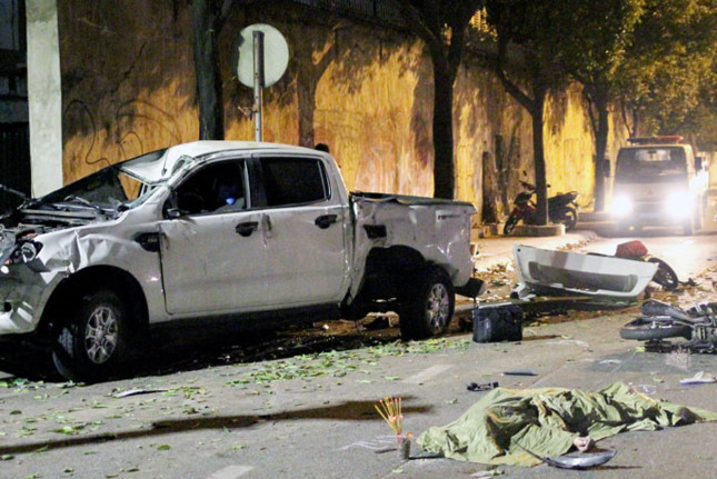 “Lúc đó xe bán tải chạy rất nhanh, leo lên dải phân cách rồi lộn nhiều vòng rồi đâm thẳng vào rất nhiều người đang dừng đèn đỏ. Nhiều người bị thương nằm la liệt. Nếu xe đó chạy thẳng thì tôi cũng chết rồi”, một nhân chứng kiến kể lại. Ảnh: Tuổi trẻ.