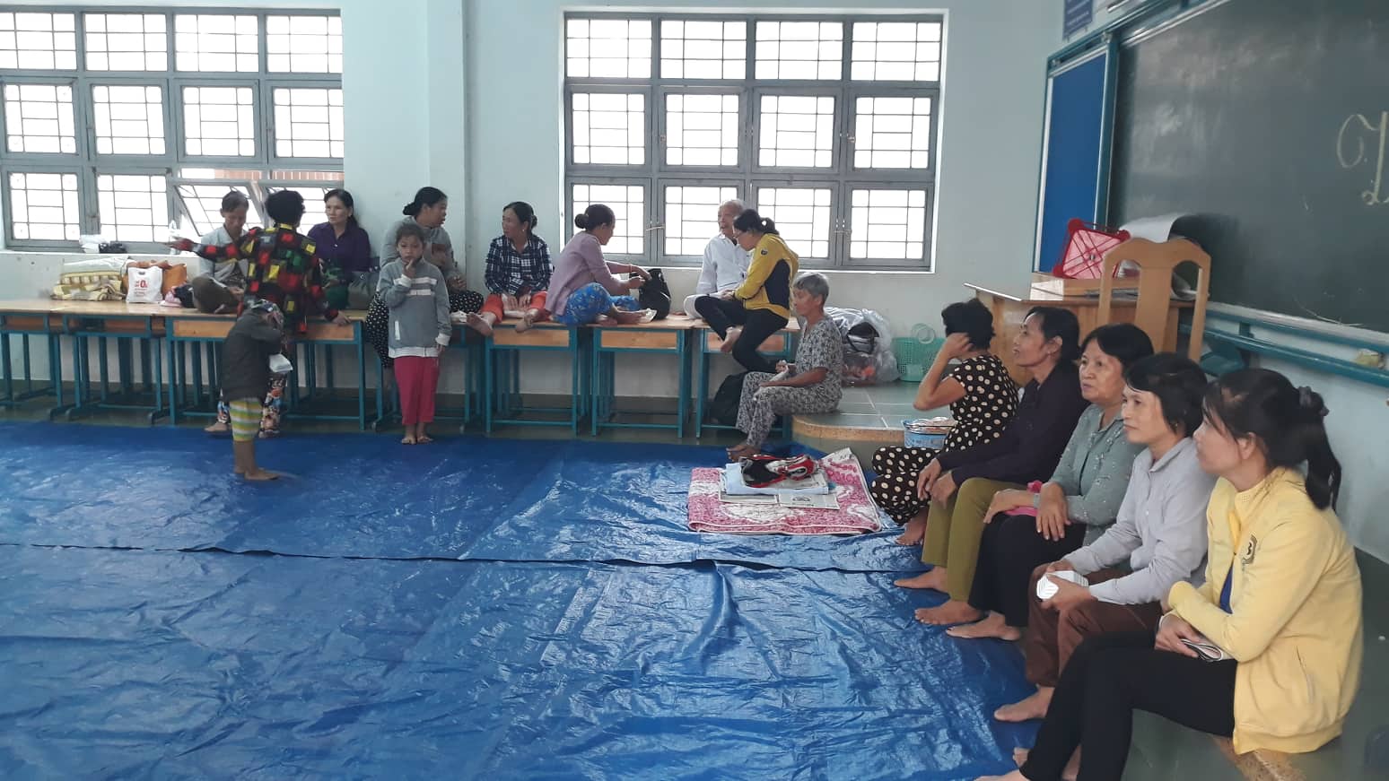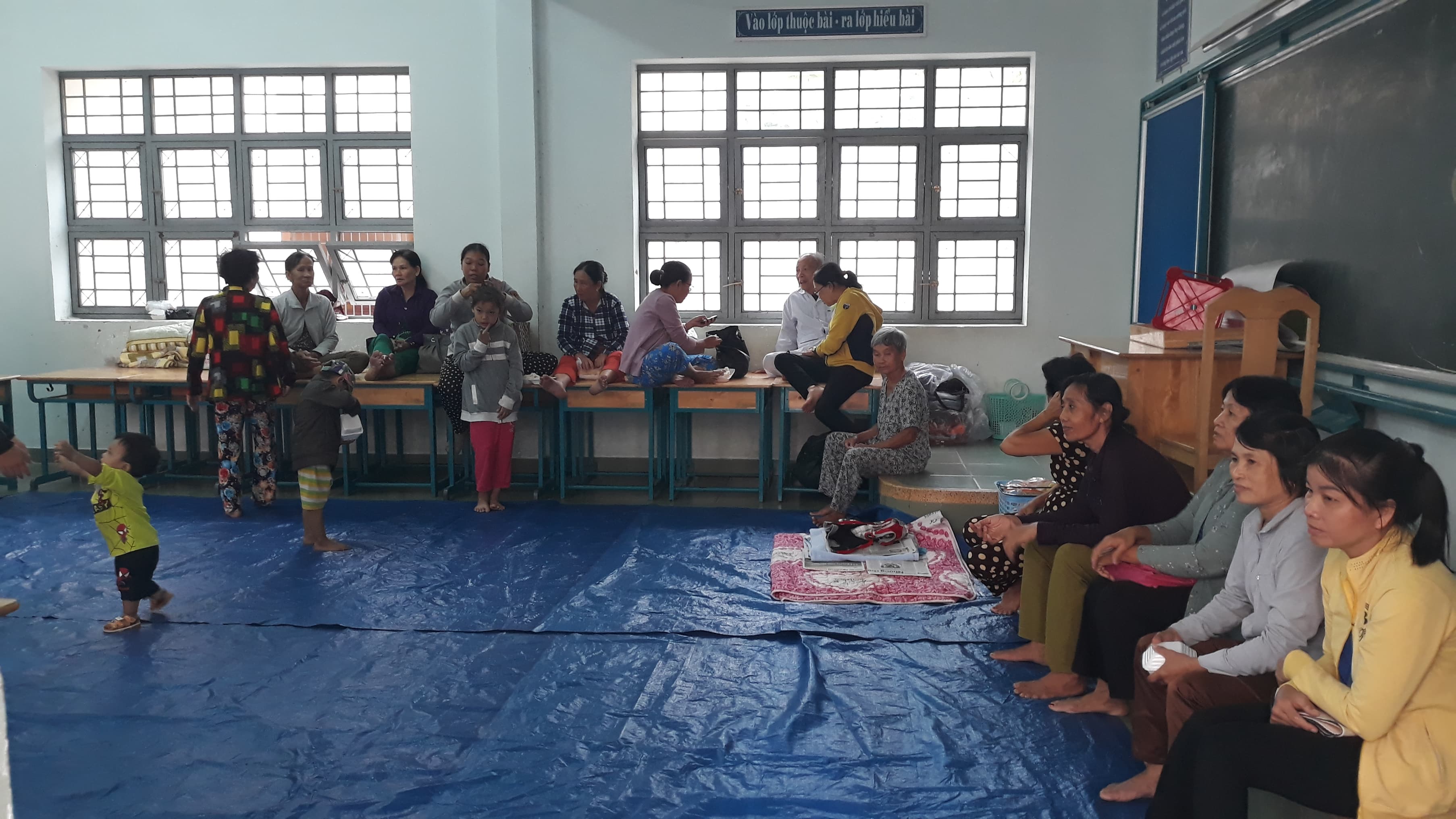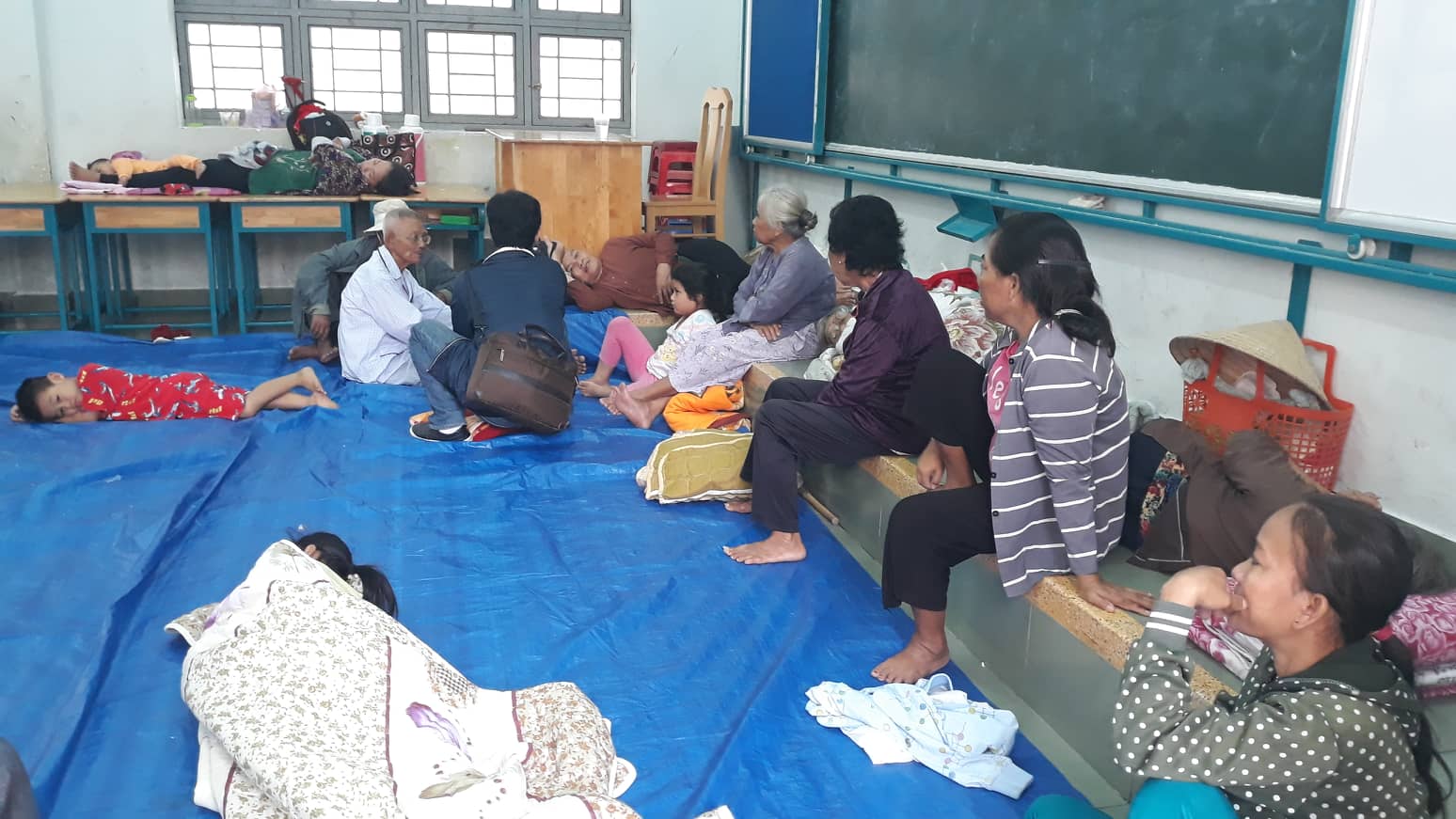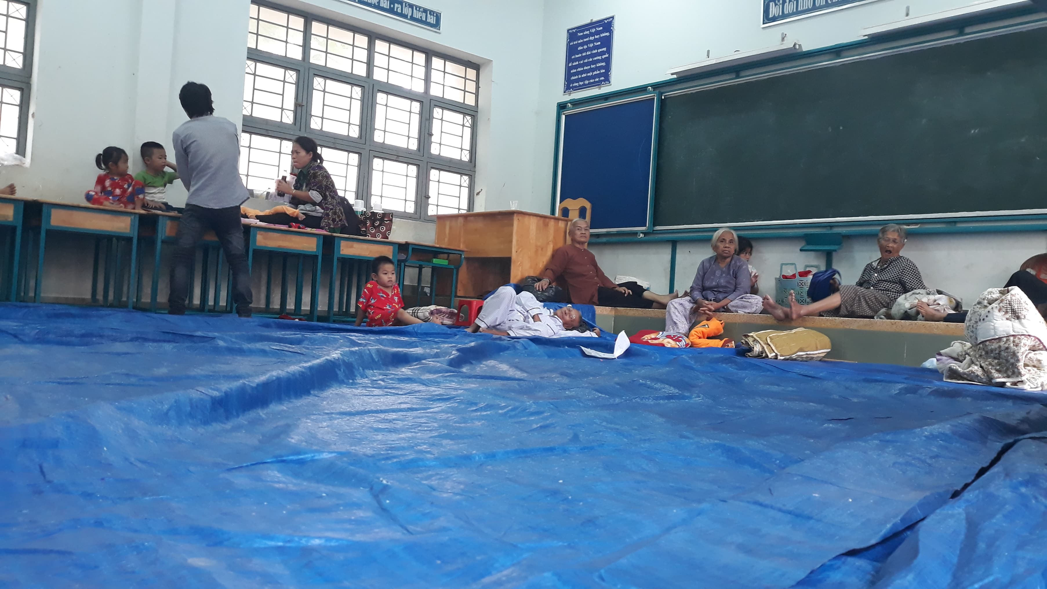 Tại đây, khoảng 200 người dân đang tránh bão số ở trong các căn phòng, hành lang.