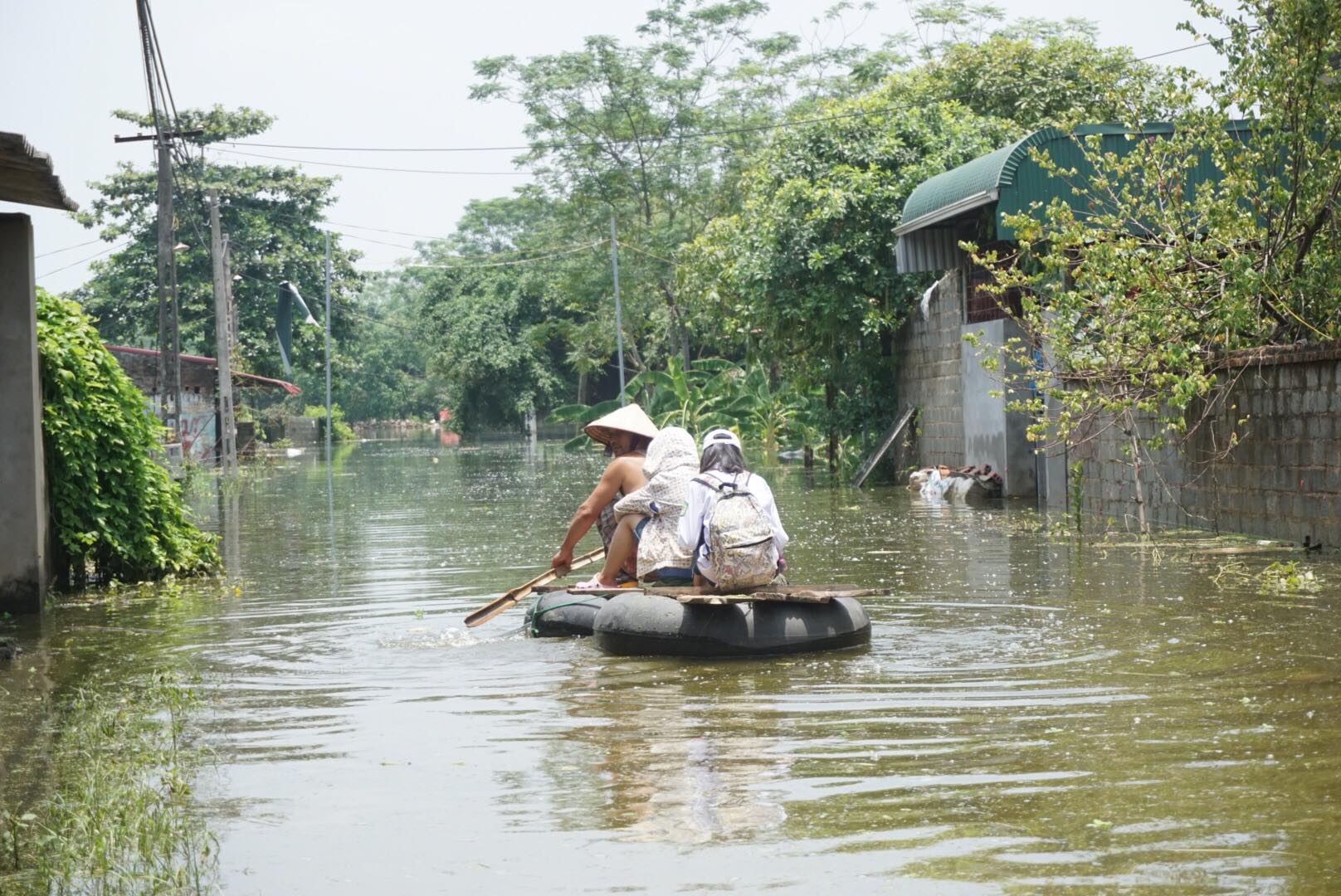 Một số khu vực các hộ dân vẫn bị cô lập trong dòng nước. Để đi lại họ phải di chuyển bằng thuyền, bè tự chế.